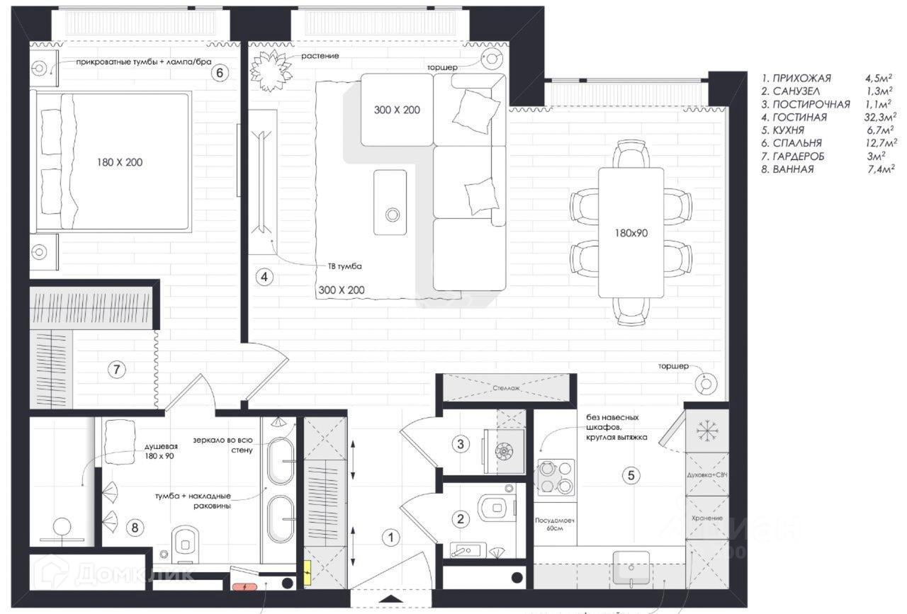 Идеальная планировка: гостиная с кухонной зоной, мастер-спальная с гардеробной, просторной ванной комнатой, гостевым санузлом и отдельной постирочной.