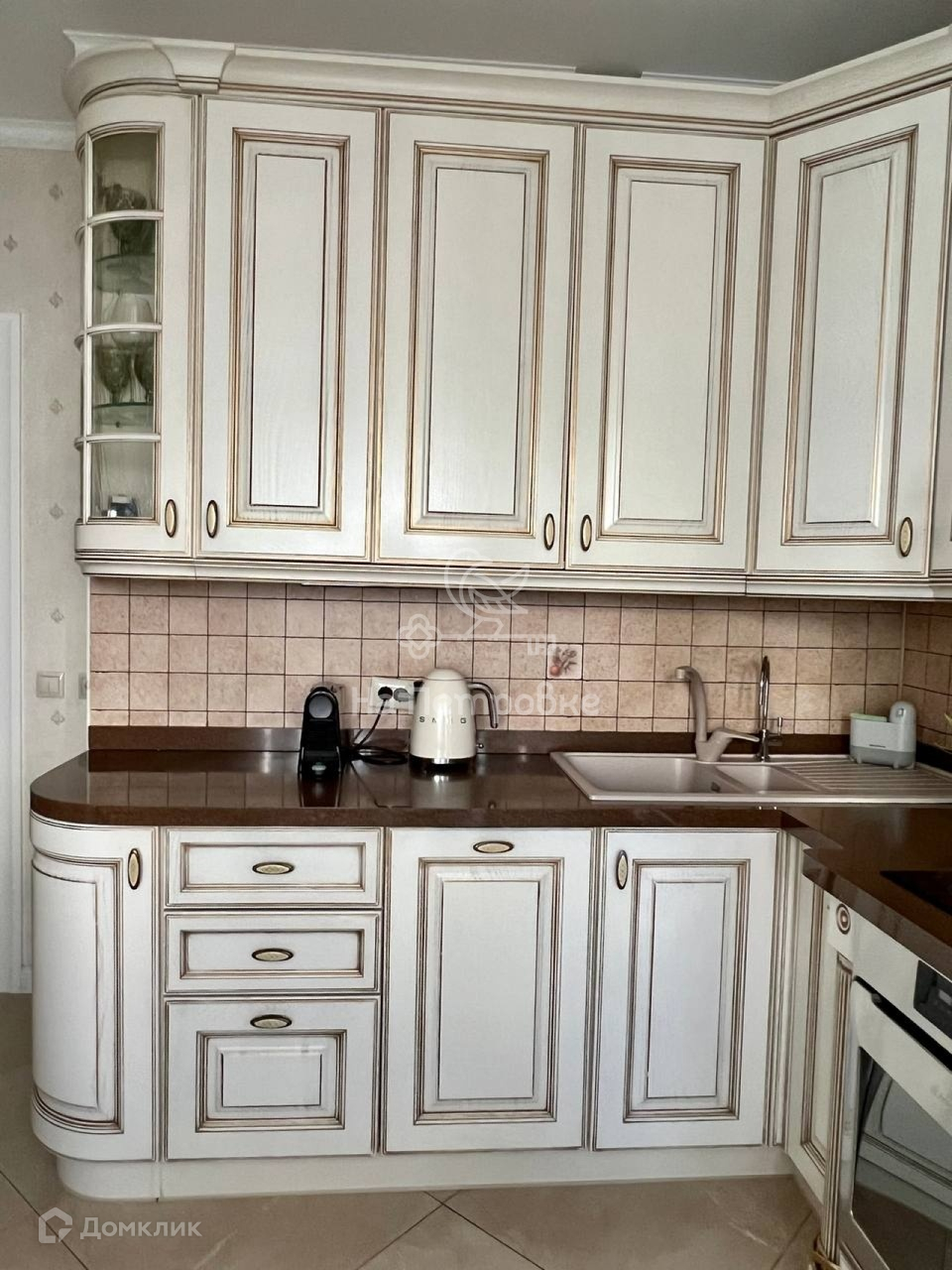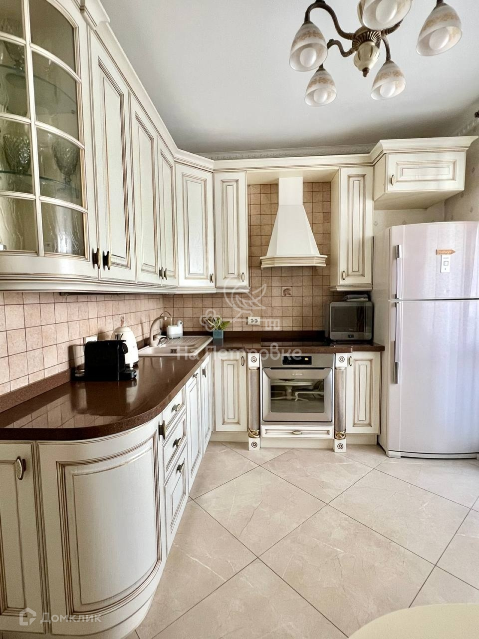 Кухня оснащена всей необходимой техникой : холодильник, плита, посудомоечная машина, и выполнена  в классическом стиле в светлых тонах.