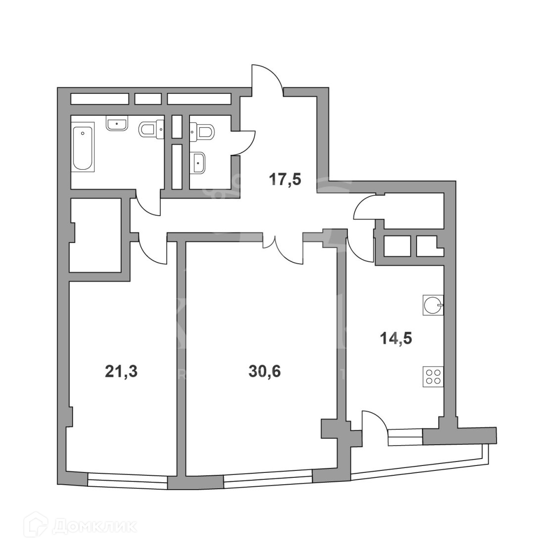 Возможная планировка: гостиная с зоной кухни, спальня, ванная комната, гостевой санузел, гардеробная, балкон.