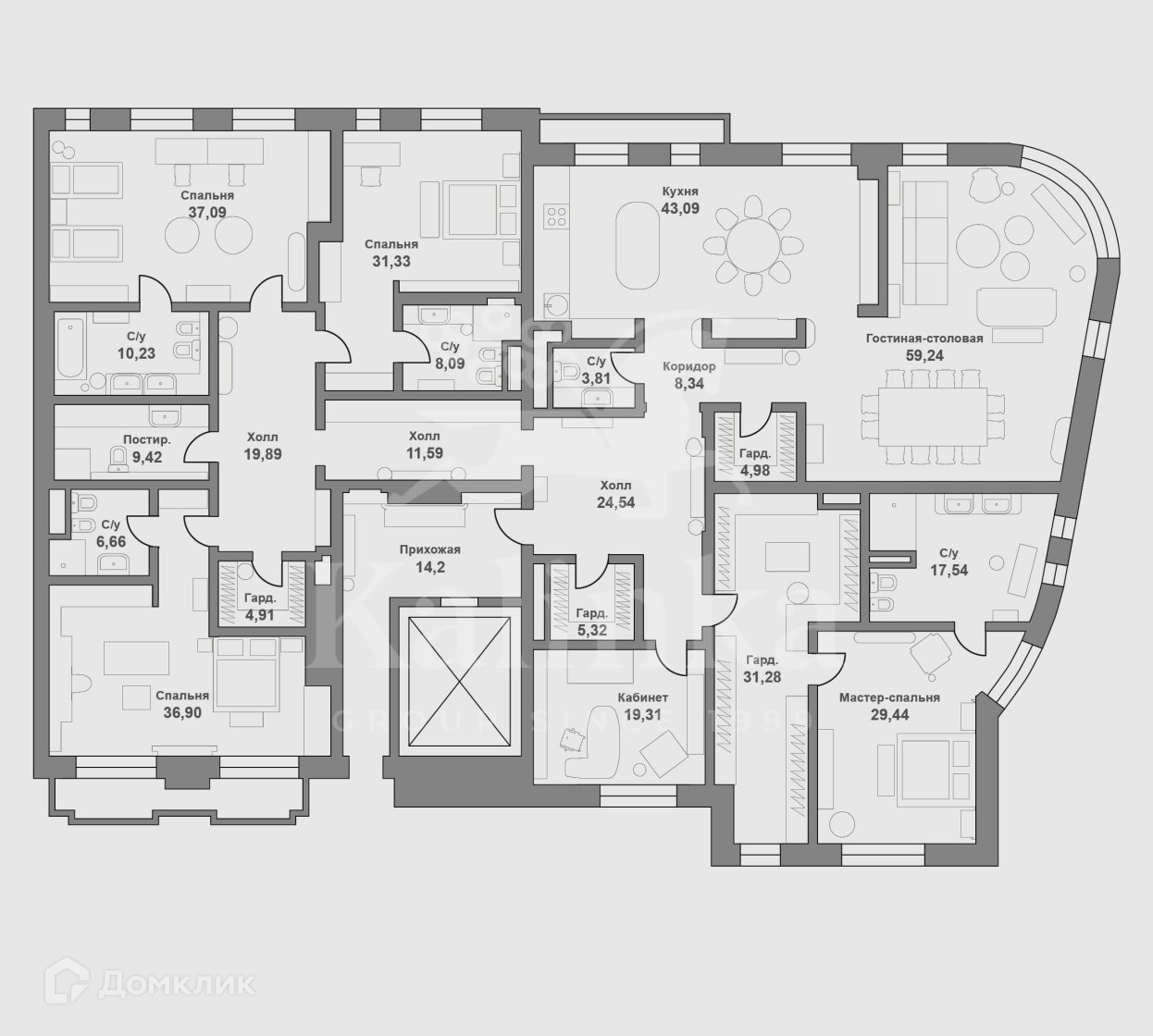 - в квартире предусмотрен гостевой санузел, хозяйственная комната с местом расположения для няни.