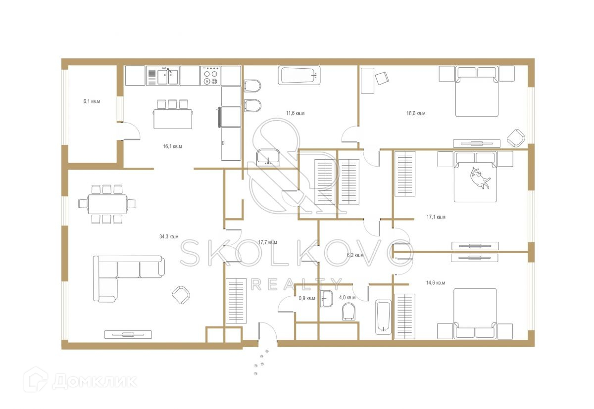 * Функциональность:  Функциональная планировка включает просторную гостиную, кухню, спальню с ванной комнатой, спальню с гардеробной, детскую спальню и общий санузел.