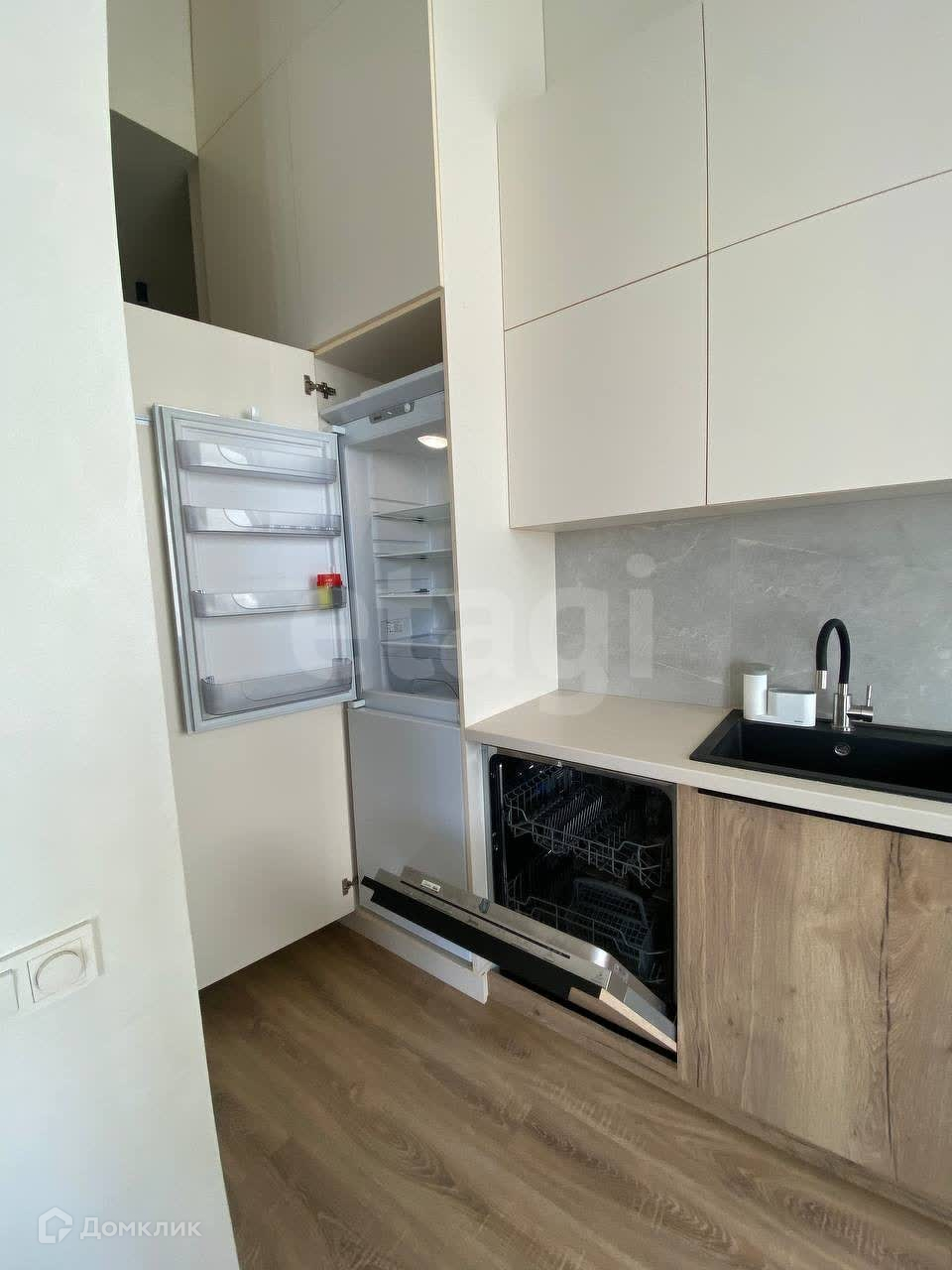 Кухня оснащена варочной поверхностью, вытяжкой, духовым шкафом, посудомоечная машина 60 см и встроенным холодильником.