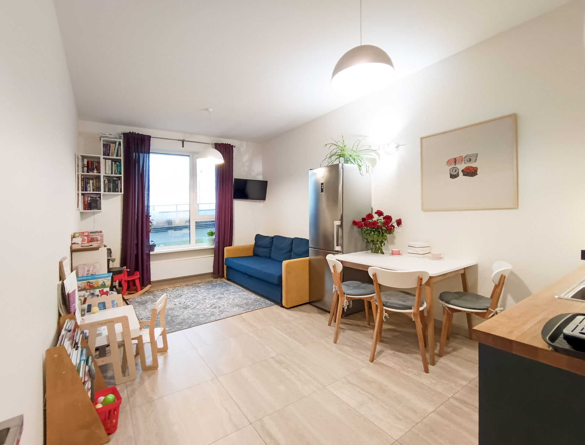 По факту в квартире две полноценных жилых комнаты (см. фото) + зона "кухня-столовая".