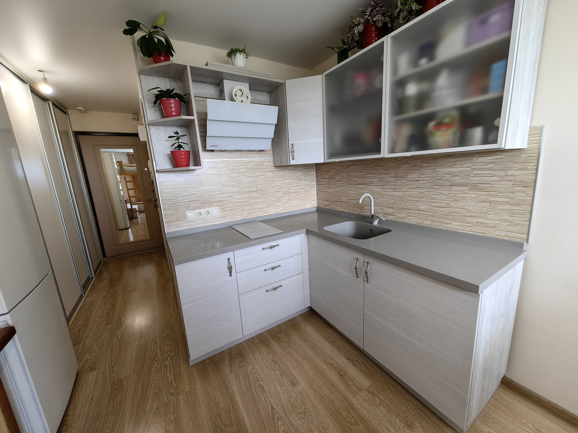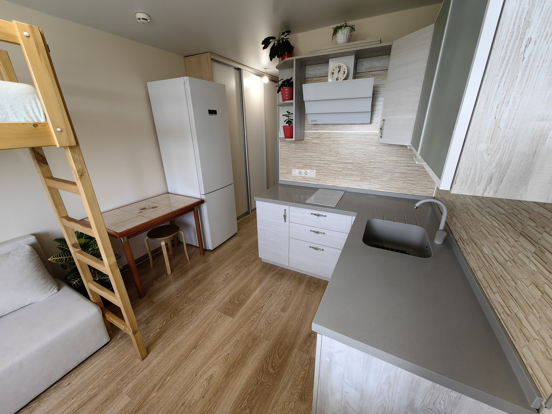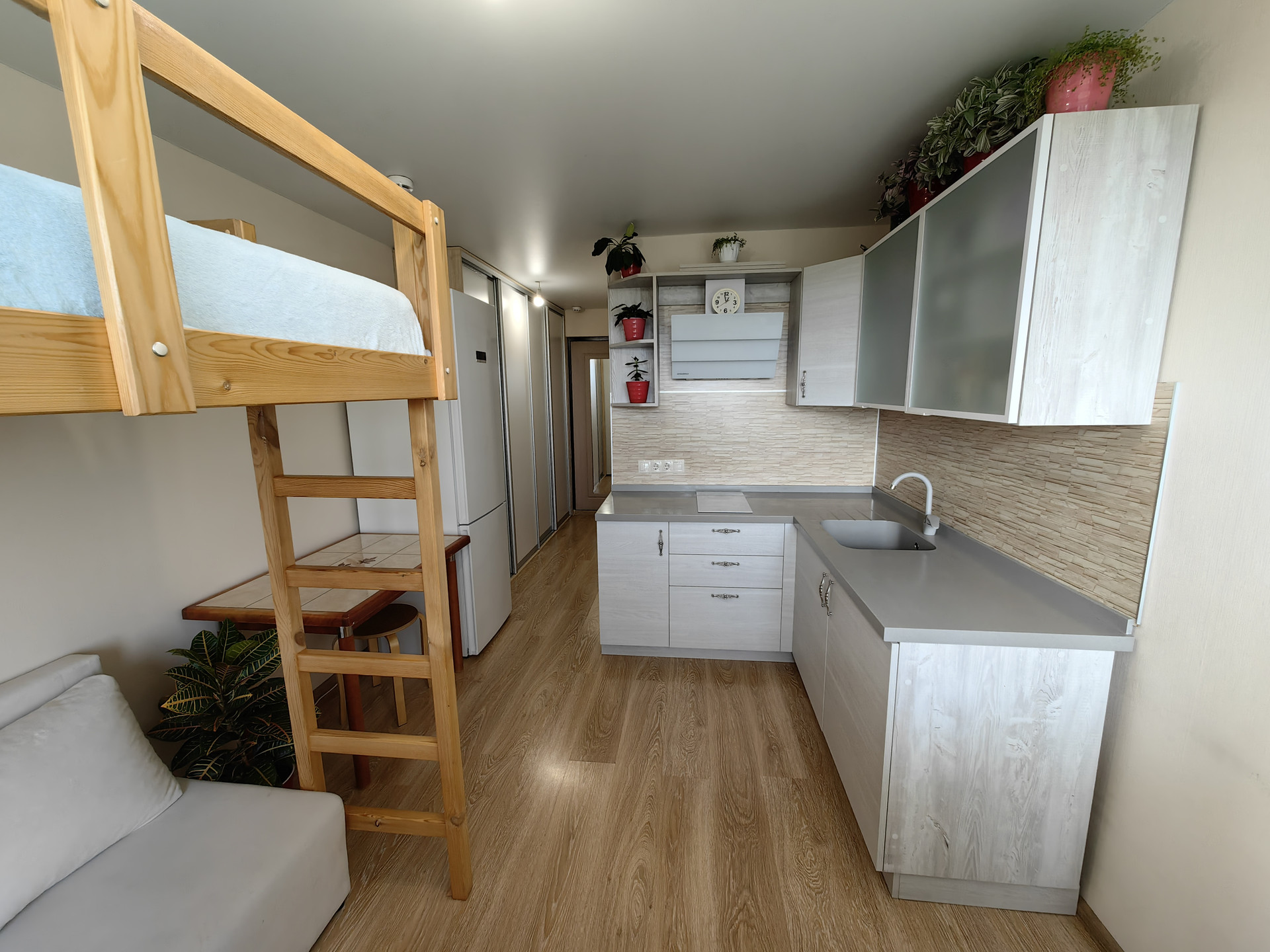 В студии есть всё необходимое для проживания: встроенный шкаф купе, кухонный гарнитур ( со столешницей из искусственного камня), кровать-чердак, диван. Совмещённый санузел.