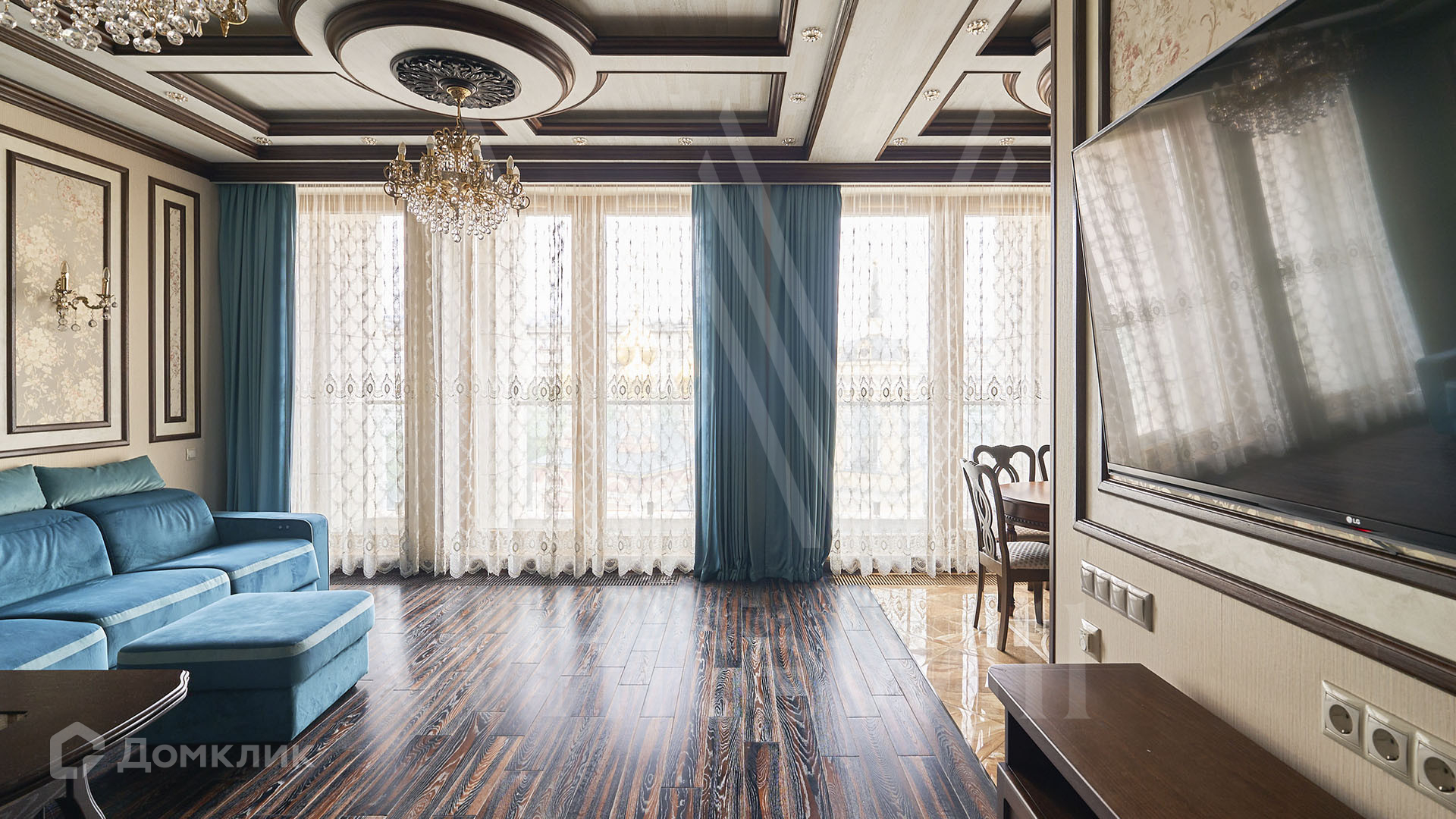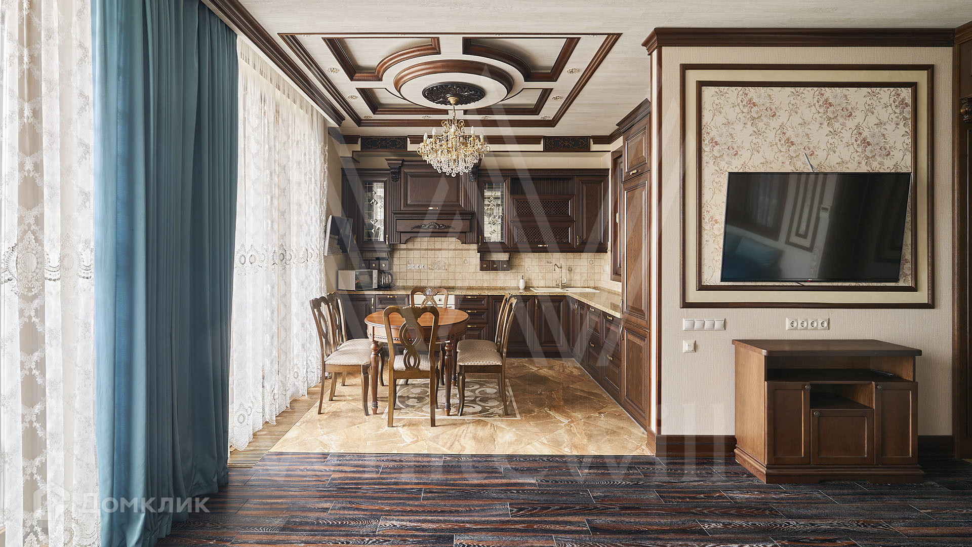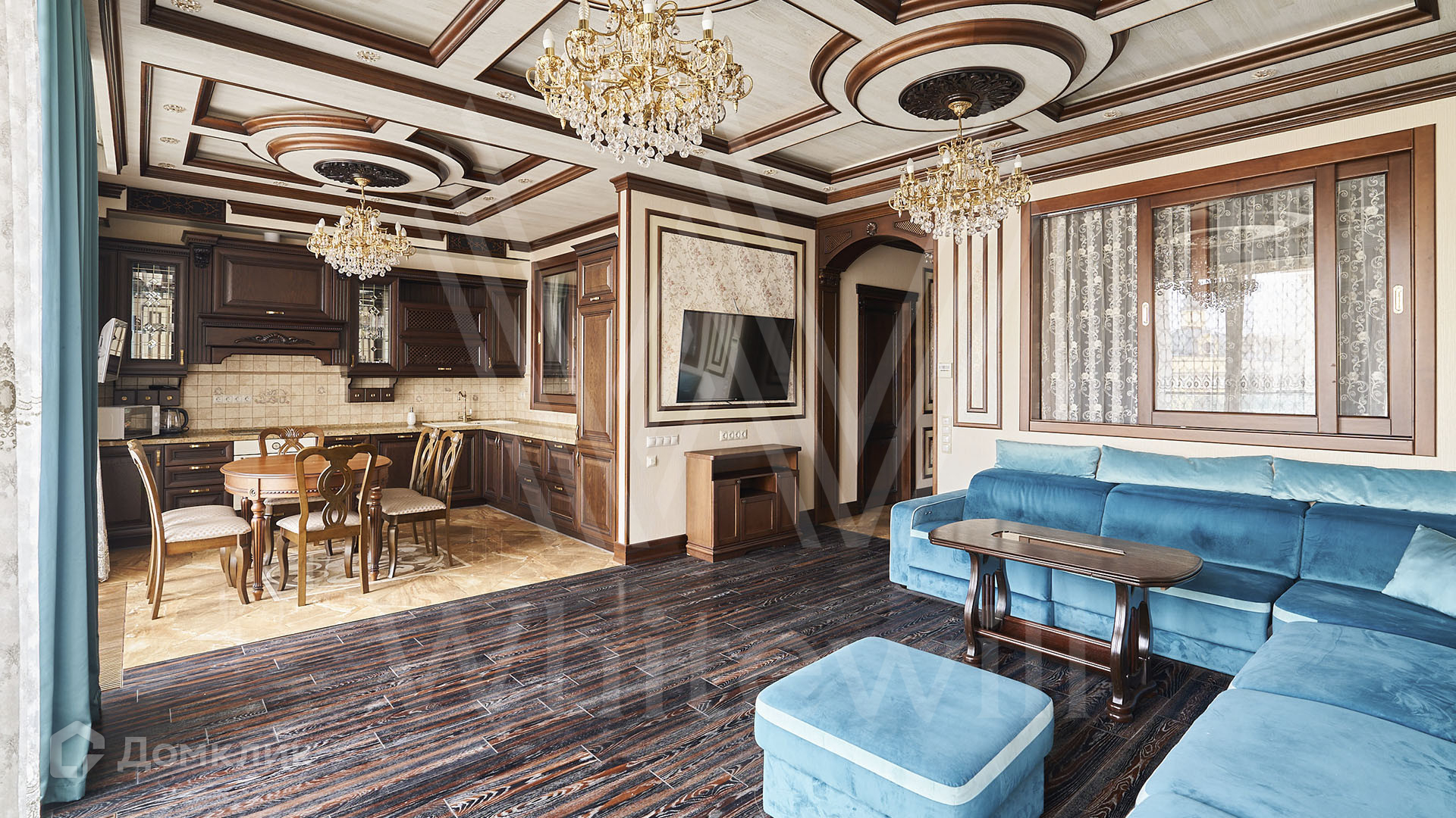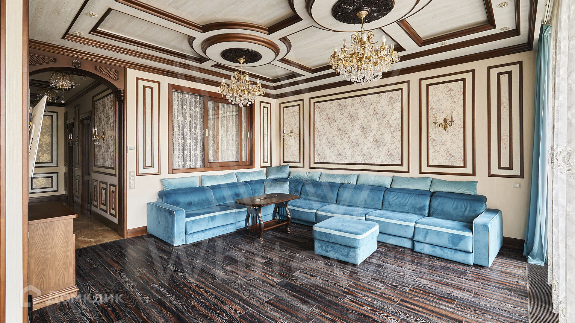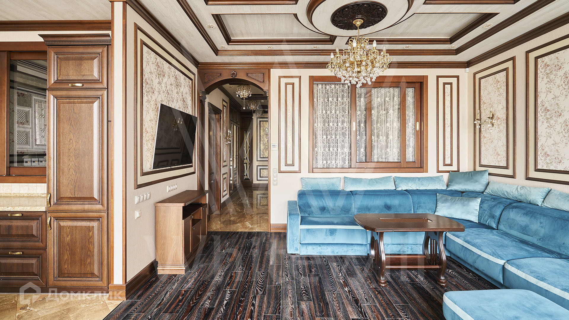 ID 197 474. Апартаменты с 2-мя спальнями общей площадью 100 м² в клубном комплексе Smolensky De Luxe. Выполнен дизайнерский ремонт в классическом стиле. Интерьер выдержан в цветах благородного дерева с мягкими акцентами бирюзы. В отделке использована натуральная древесина и камень. Полы выложены мрамором и тёмным паркетом. Кессонные потолки с резными узорами и золотистыми подвесными люстрами с декором из стекла.