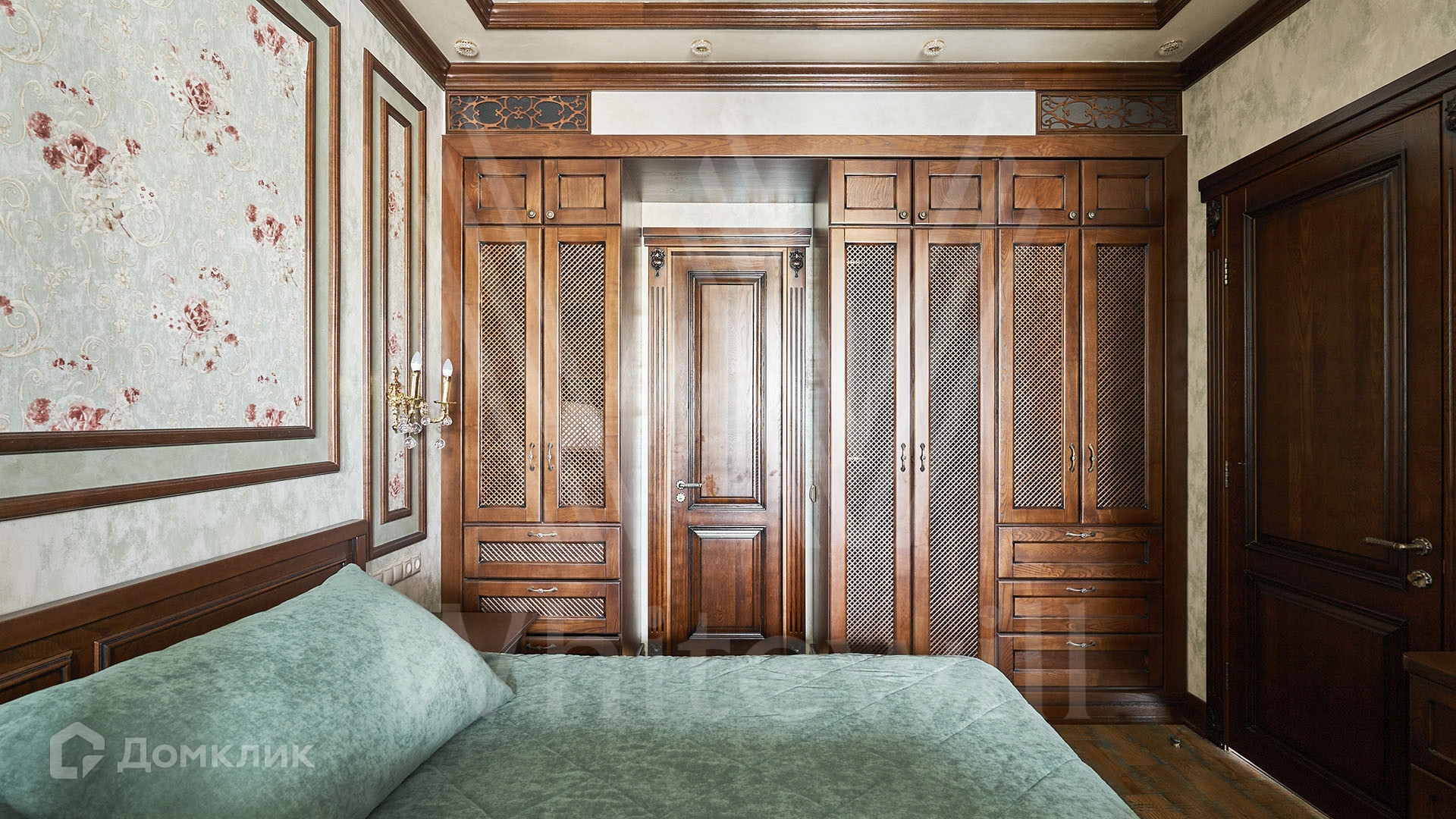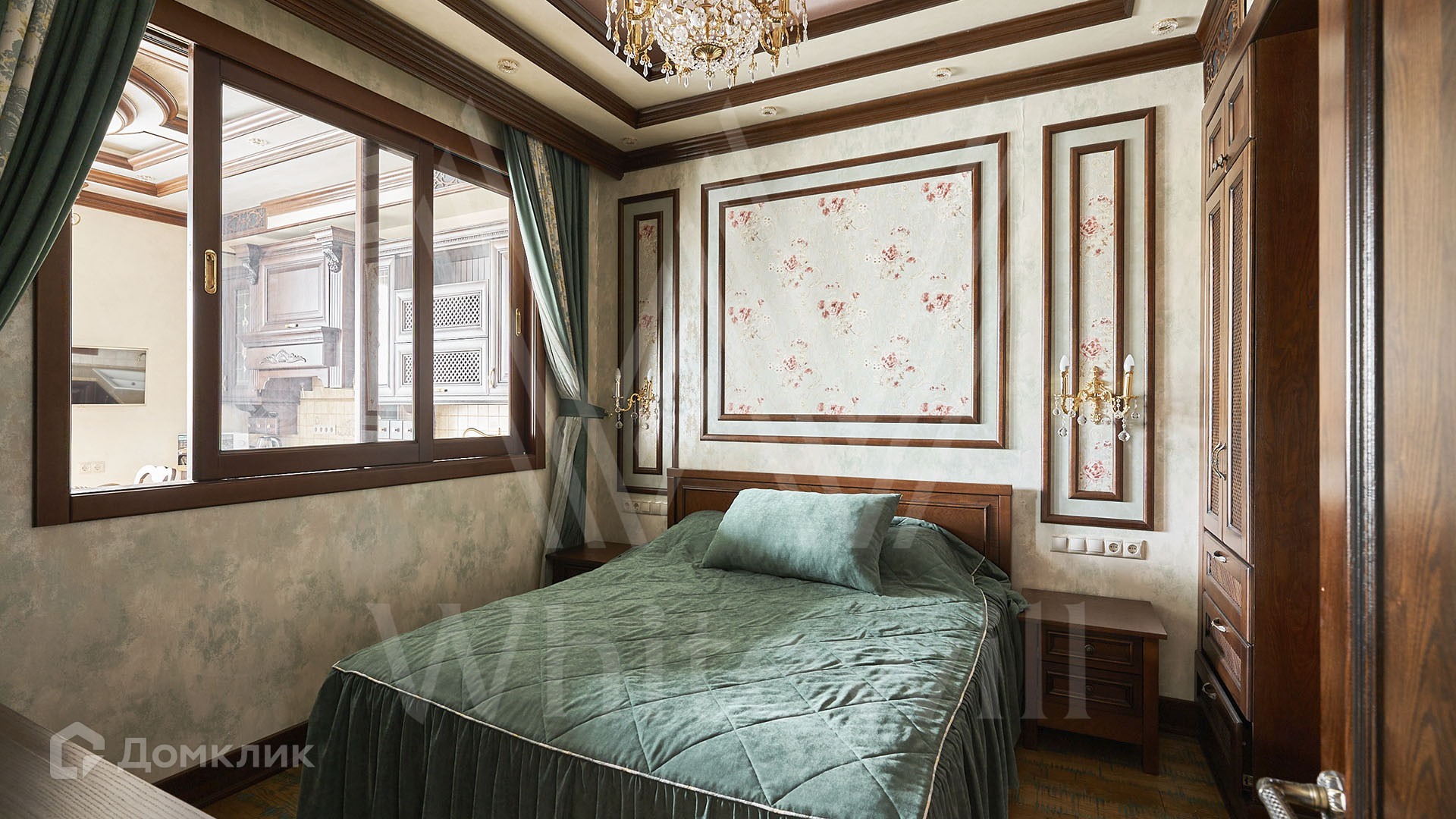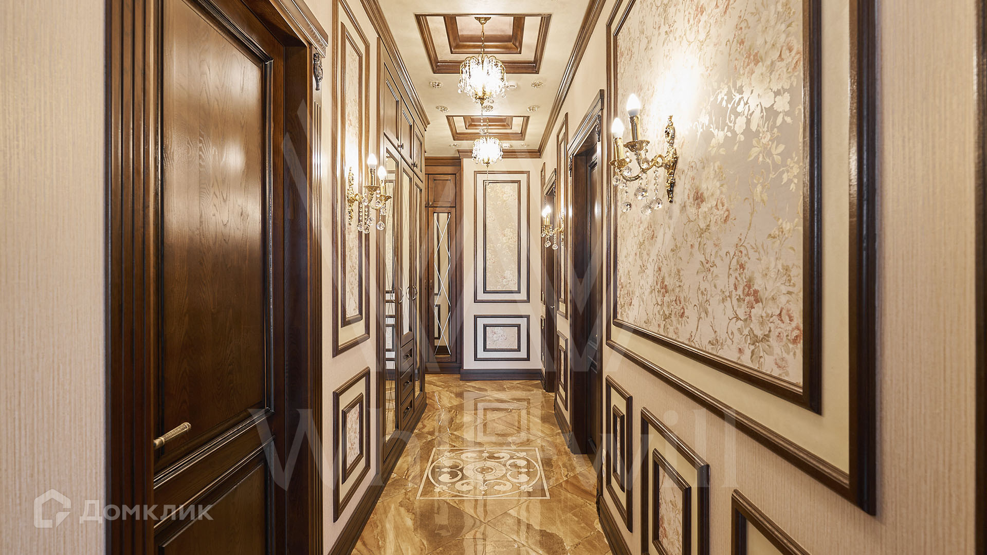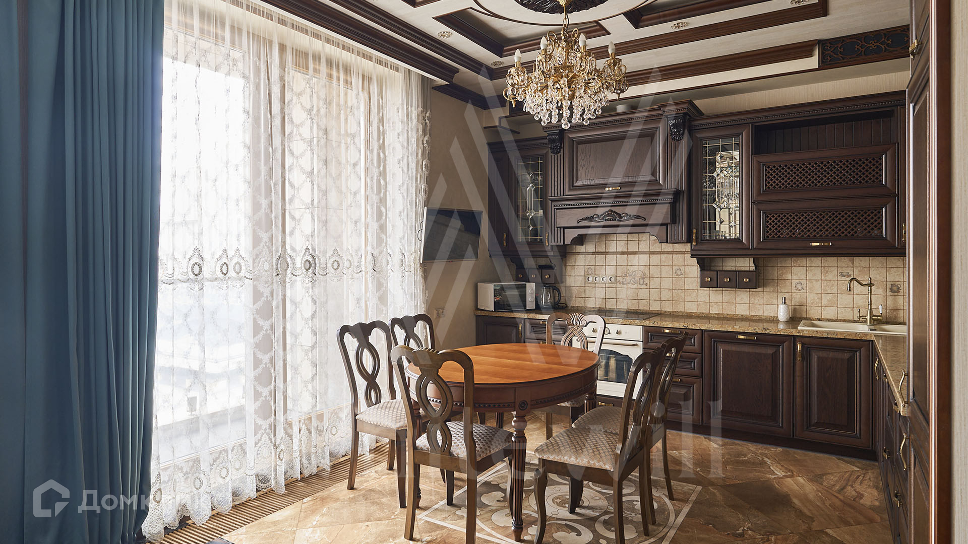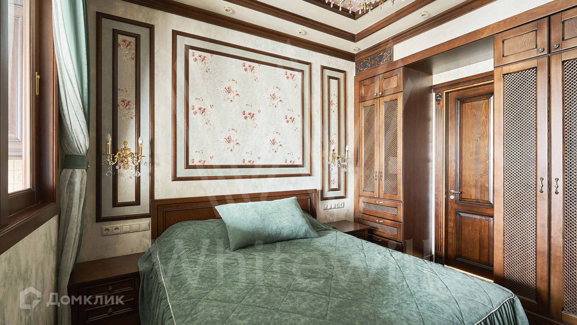ID 197 474. Апартаменты с 2-мя спальнями общей площадью 100 м² в клубном комплексе Smolensky De Luxe. Выполнен дизайнерский ремонт в классическом стиле. Интерьер выдержан в цветах благородного дерева с мягкими акцентами бирюзы. В отделке использована натуральная древесина и камень. Полы выложены мрамором и тёмным паркетом. Кессонные потолки с резными узорами и золотистыми подвесными люстрами с декором из стекла.
