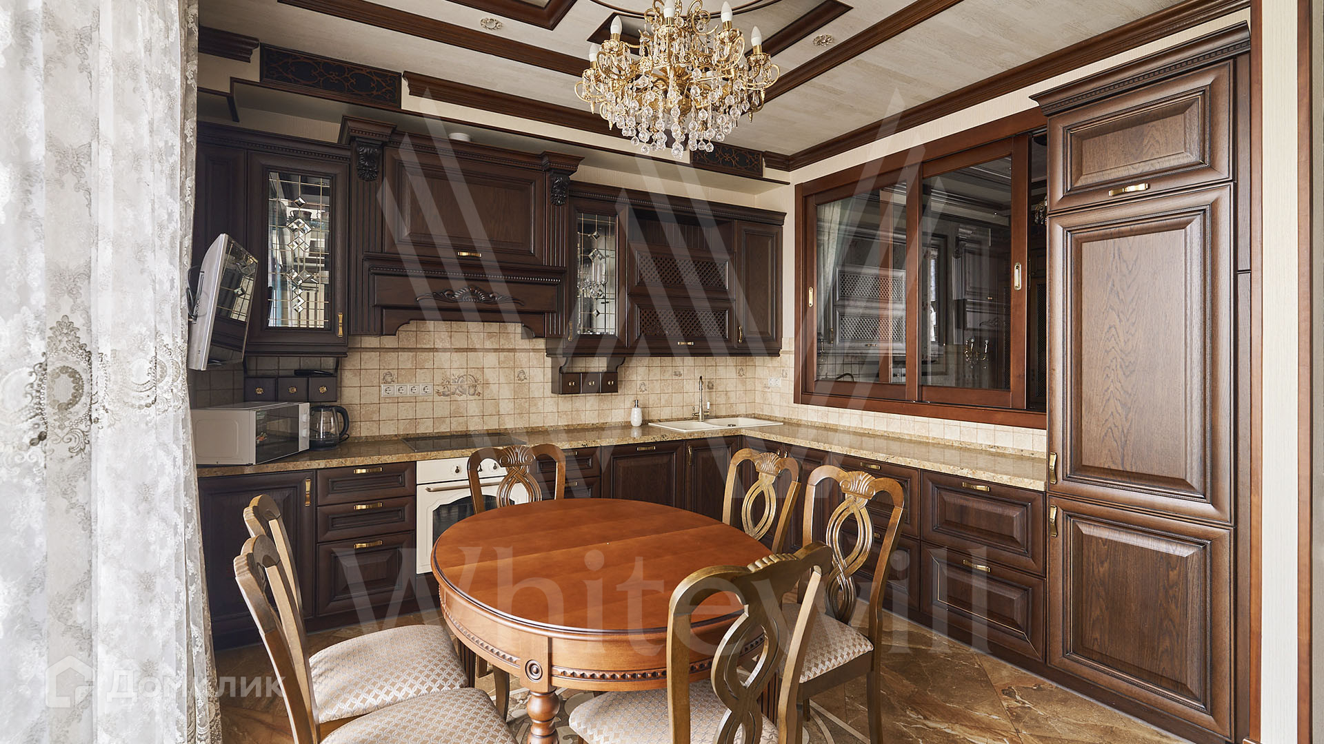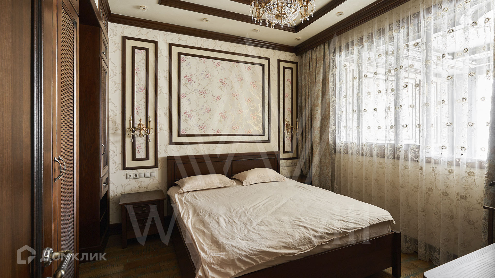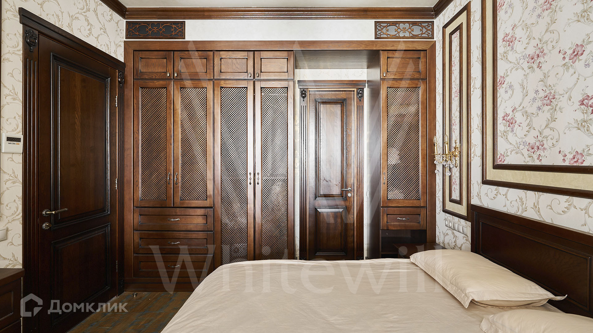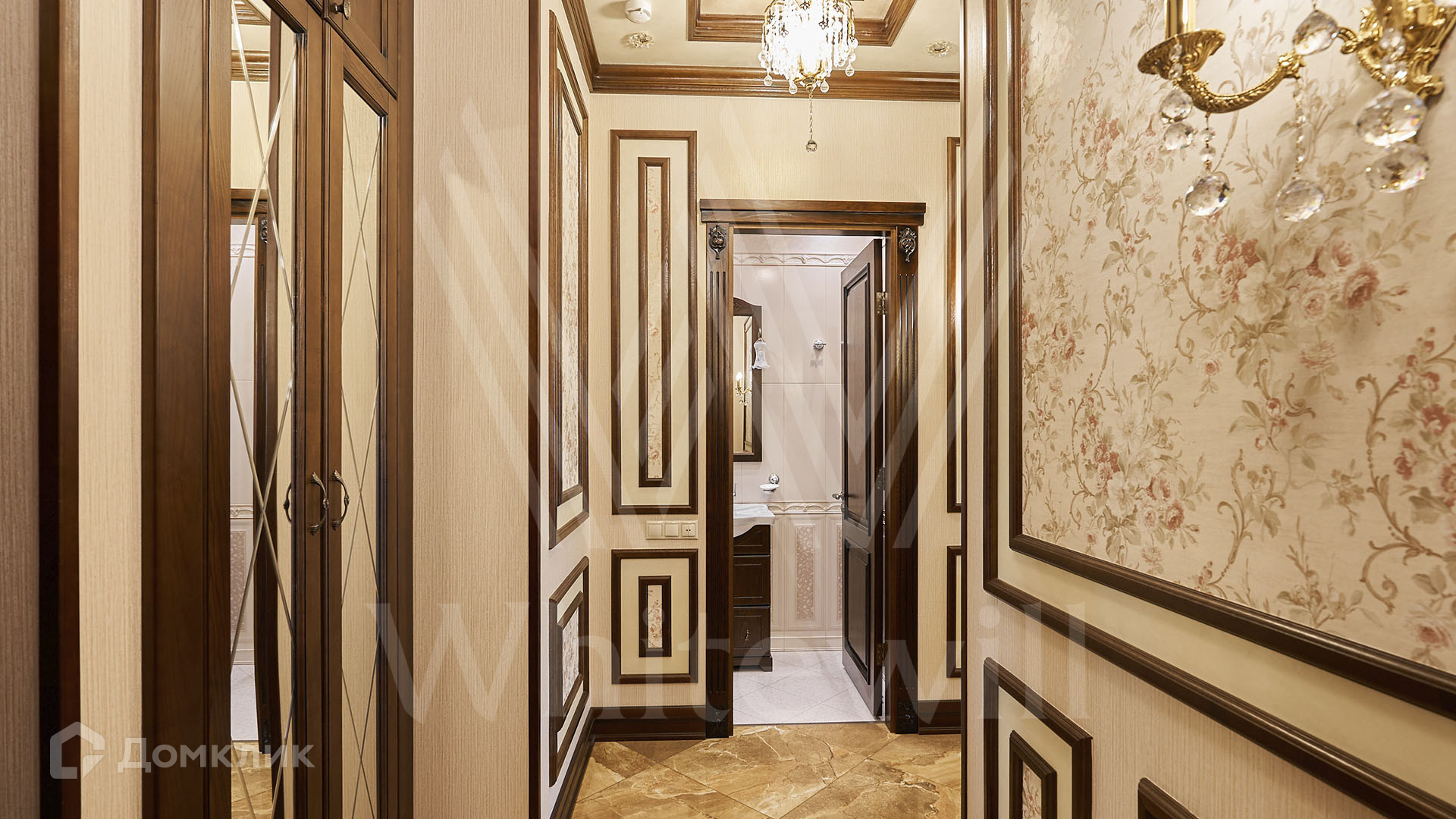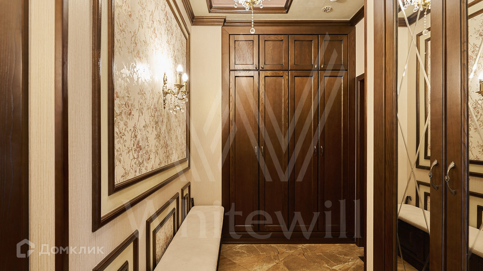 ID 197 474. Апартаменты с 2-мя спальнями общей площадью 100 м² в клубном комплексе Smolensky De Luxe. Выполнен дизайнерский ремонт в классическом стиле. Интерьер выдержан в цветах благородного дерева с мягкими акцентами бирюзы. В отделке использована натуральная древесина и камень. Полы выложены мрамором и тёмным паркетом. Кессонные потолки с резными узорами и золотистыми подвесными люстрами с декором из стекла.