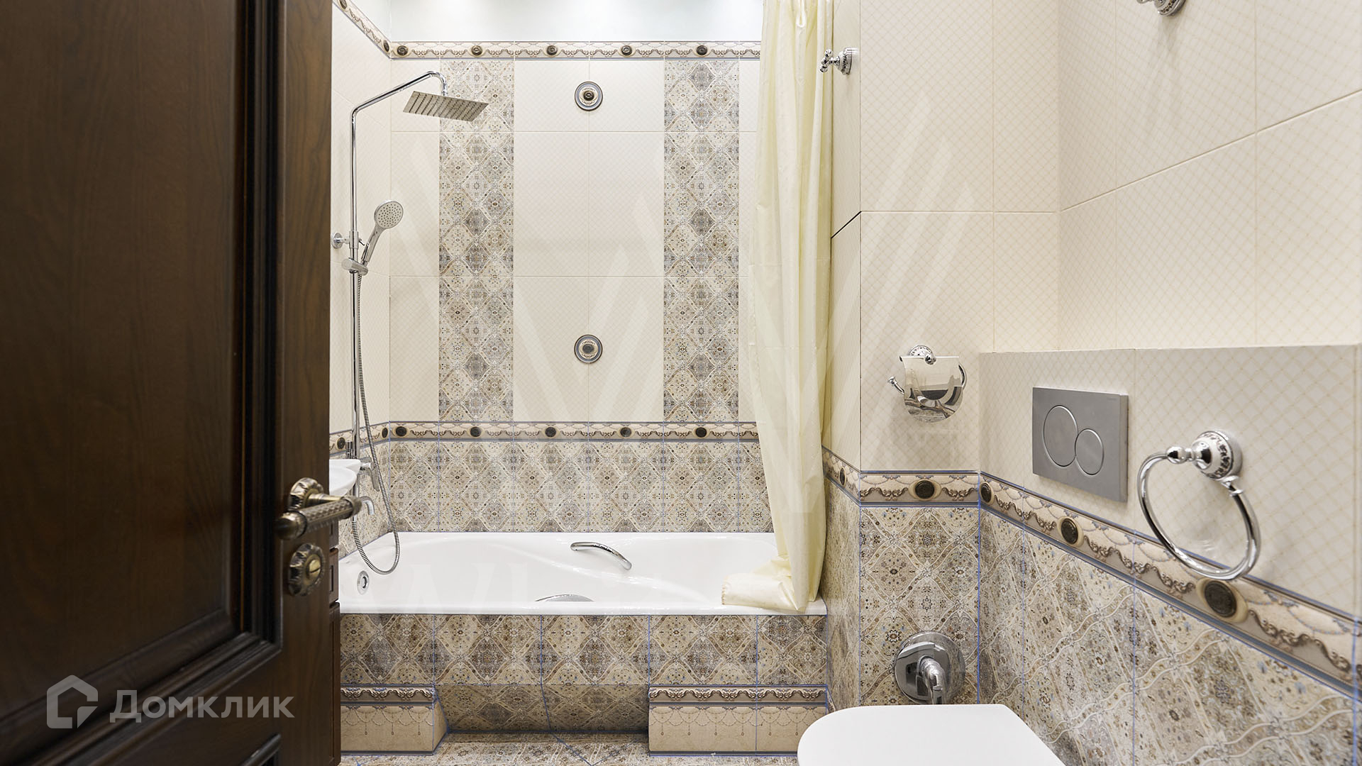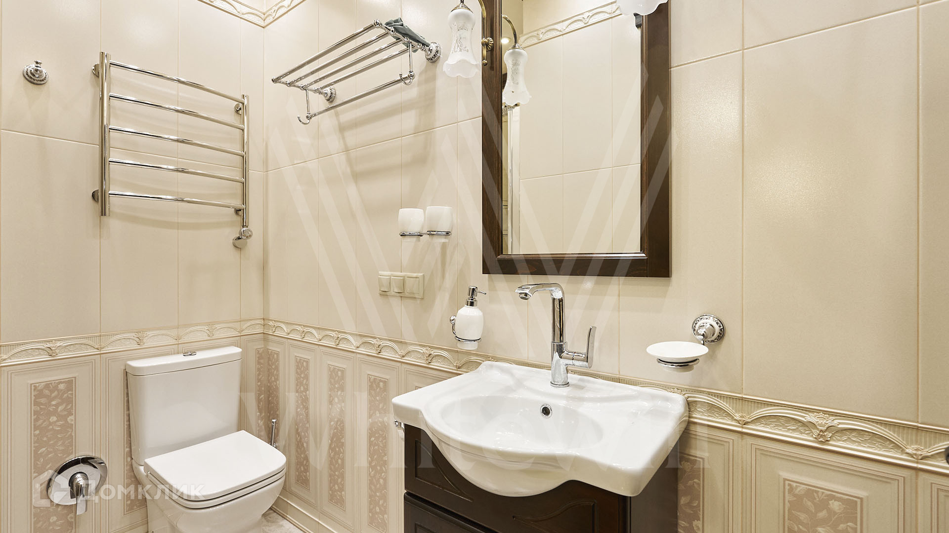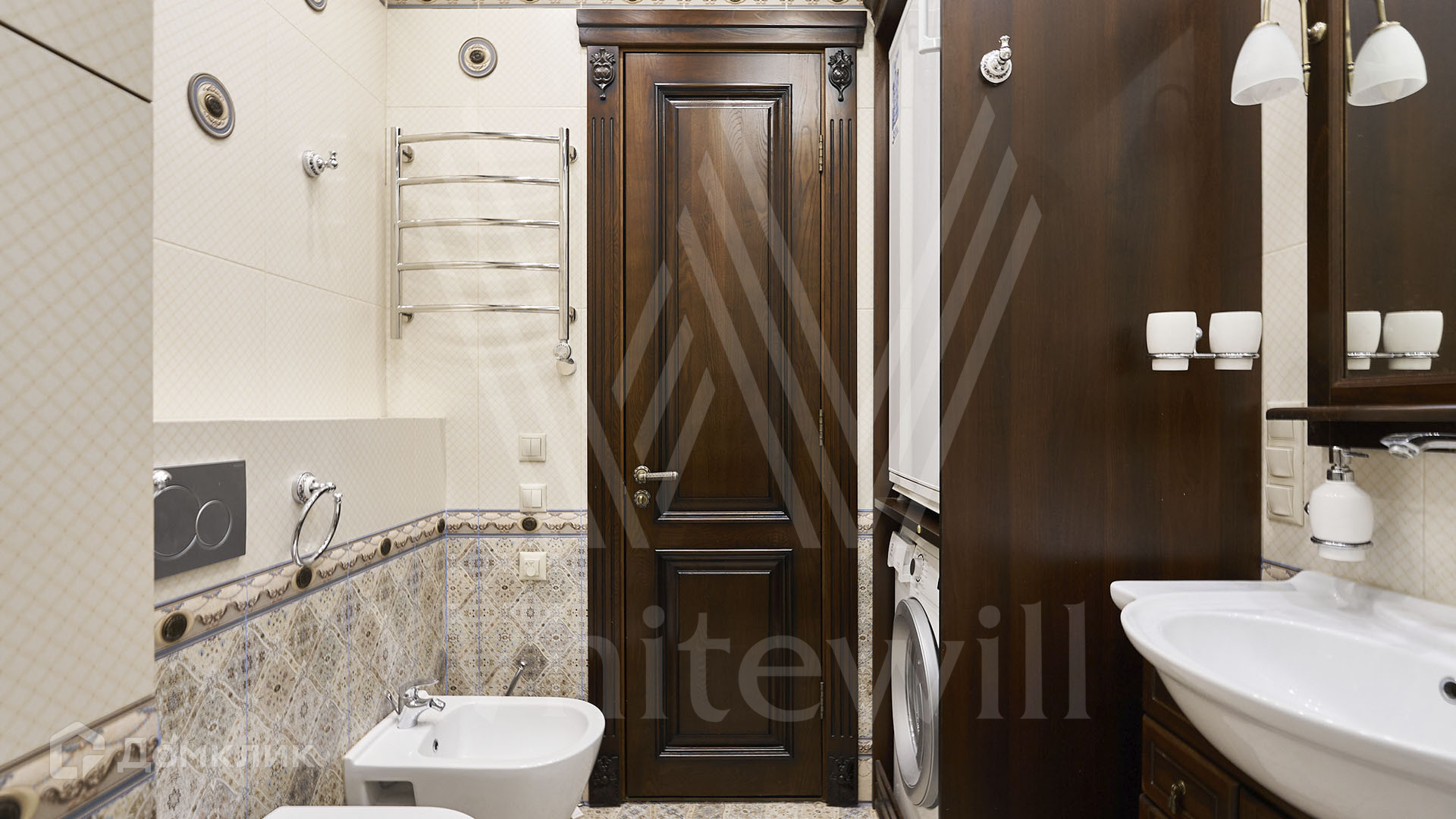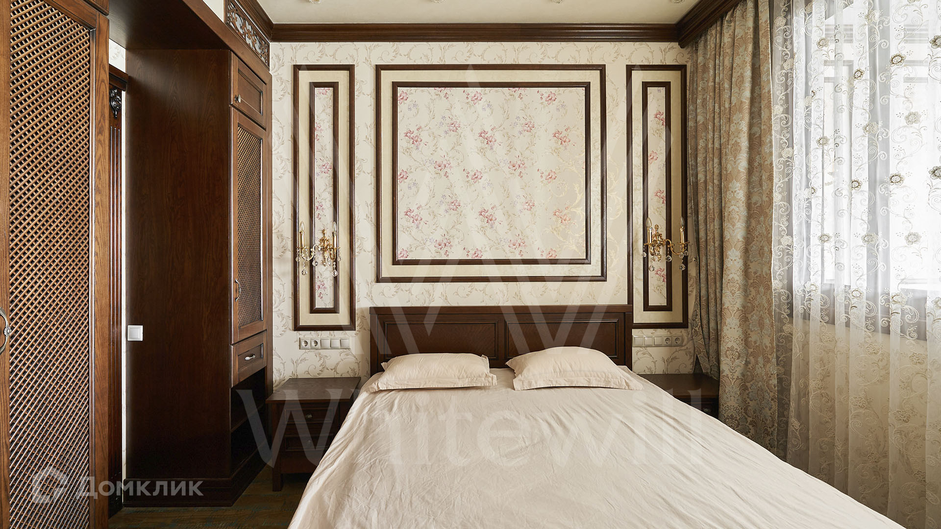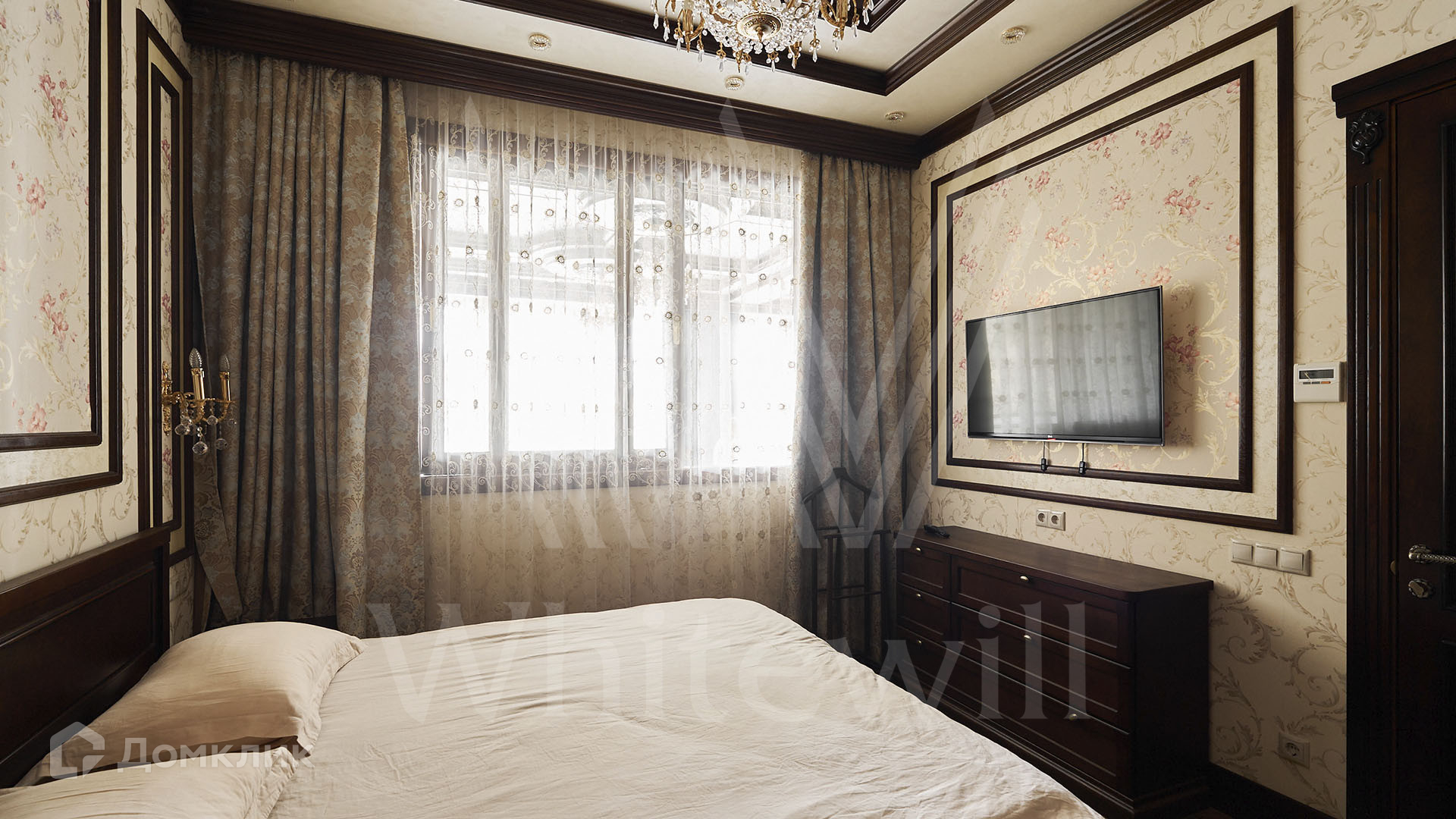 ID 197 474. Апартаменты с 2-мя спальнями общей площадью 100 м² в клубном комплексе Smolensky De Luxe. Выполнен дизайнерский ремонт в классическом стиле. Интерьер выдержан в цветах благородного дерева с мягкими акцентами бирюзы. В отделке использована натуральная древесина и камень. Полы выложены мрамором и тёмным паркетом. Кессонные потолки с резными узорами и золотистыми подвесными люстрами с декором из стекла.