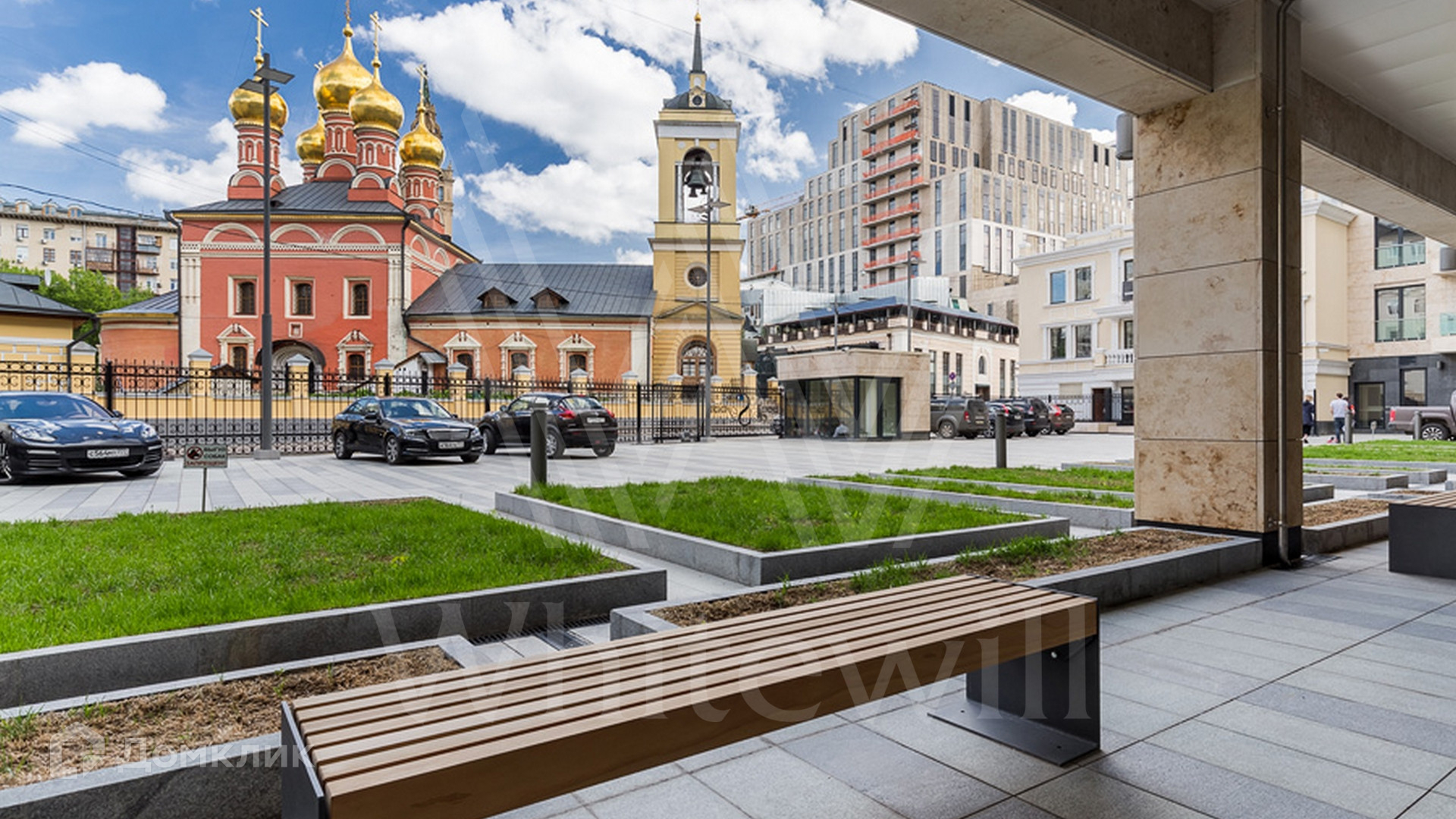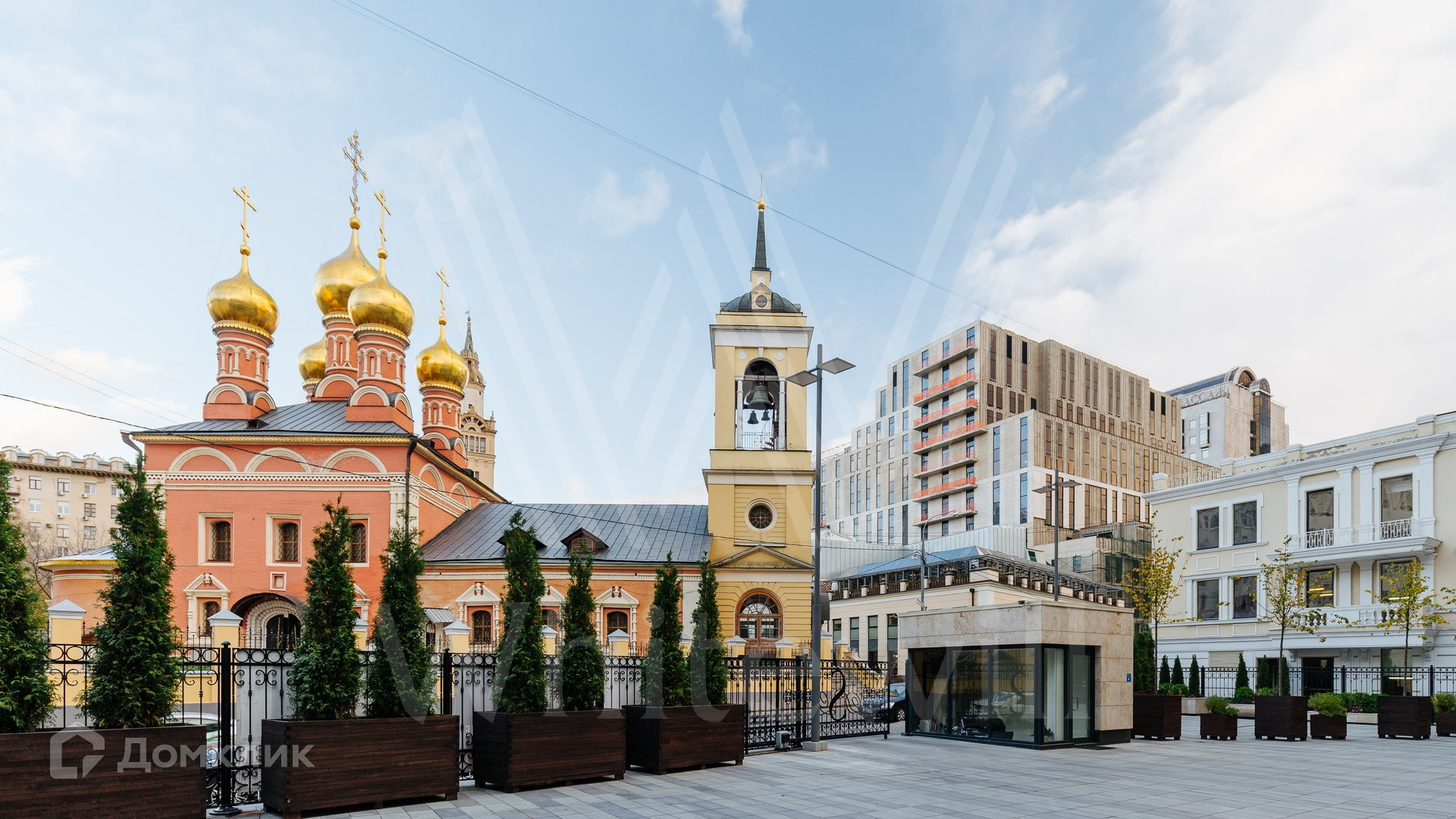 Планировка: холл, кухня-гостиная, 2 спальни со своими ванными комнатами и встроенными гардеробными шкафами, гостевой санузел, выход балкон. Установлена мягкая мебель, в гостиной большой угловой диван, обеденный стол на 4 персоны. Оборудована деревянная кухня со встроенной бытовой техникой. С балкона открывается вид на Никольскую церковь в сторону Садового кольца и Нового Арбата.