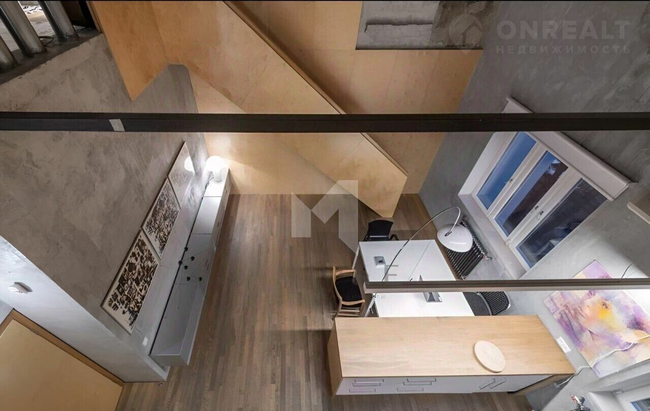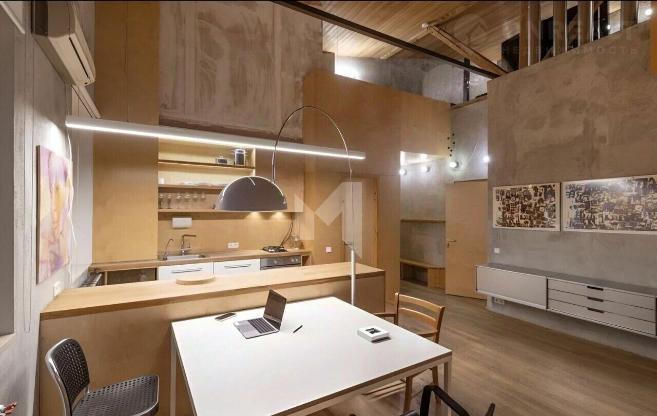 • 1-й уровень: Просторная кухня-гостиная, зал с кожаным диваном, зоной для просмотра телевизора и библиотекой. Ванная комната с мраморной сантехникой и окном. Изготовленные на заказ стеллажи и шкафы из экологически чистой фанеры. Продуманное освещение с использованием светильников от престижных брендов. Два балкона.
