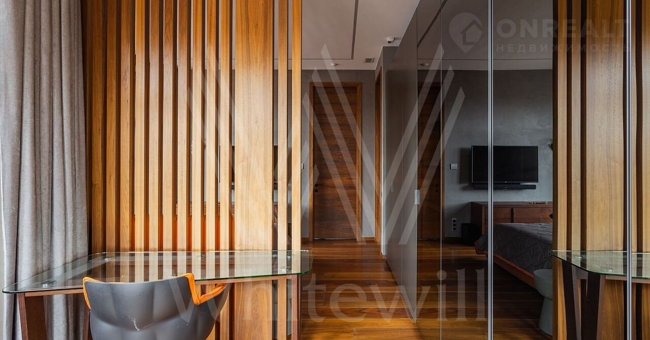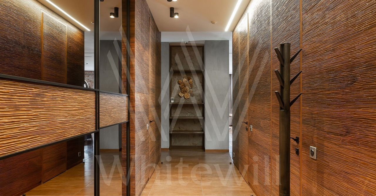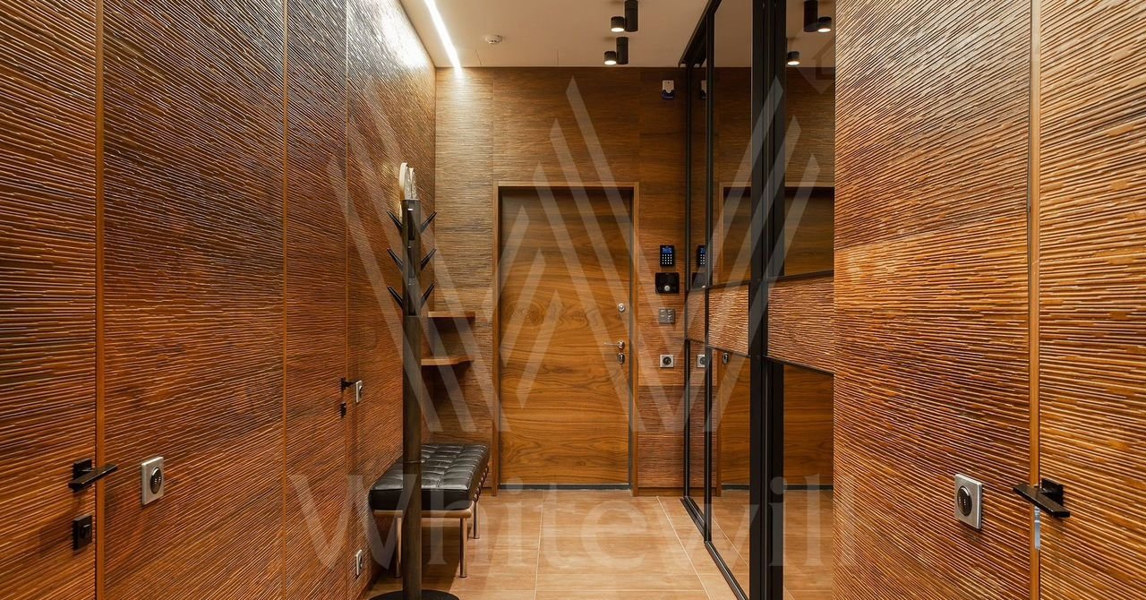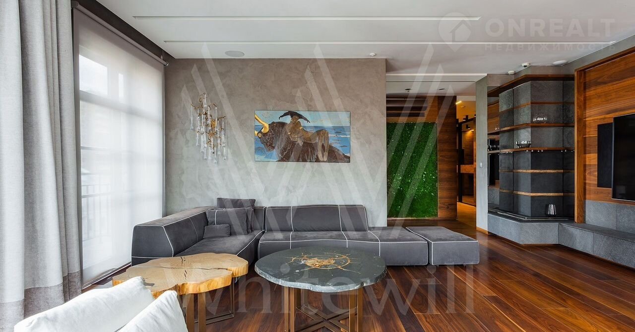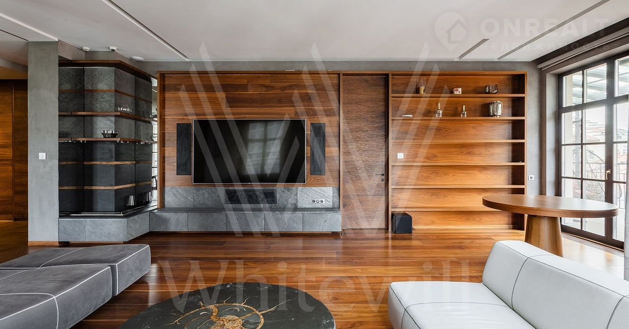 Выполнена авторская отделка с использованием натуральных материалов — американских орех, древний аммонит. На полу выложены плитка и паркетная доска. Произведены работы по комплексной шумоизоляции, установлены системы «умный дом» и индивидуального кондиционирования.