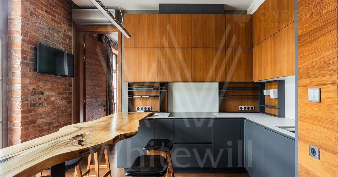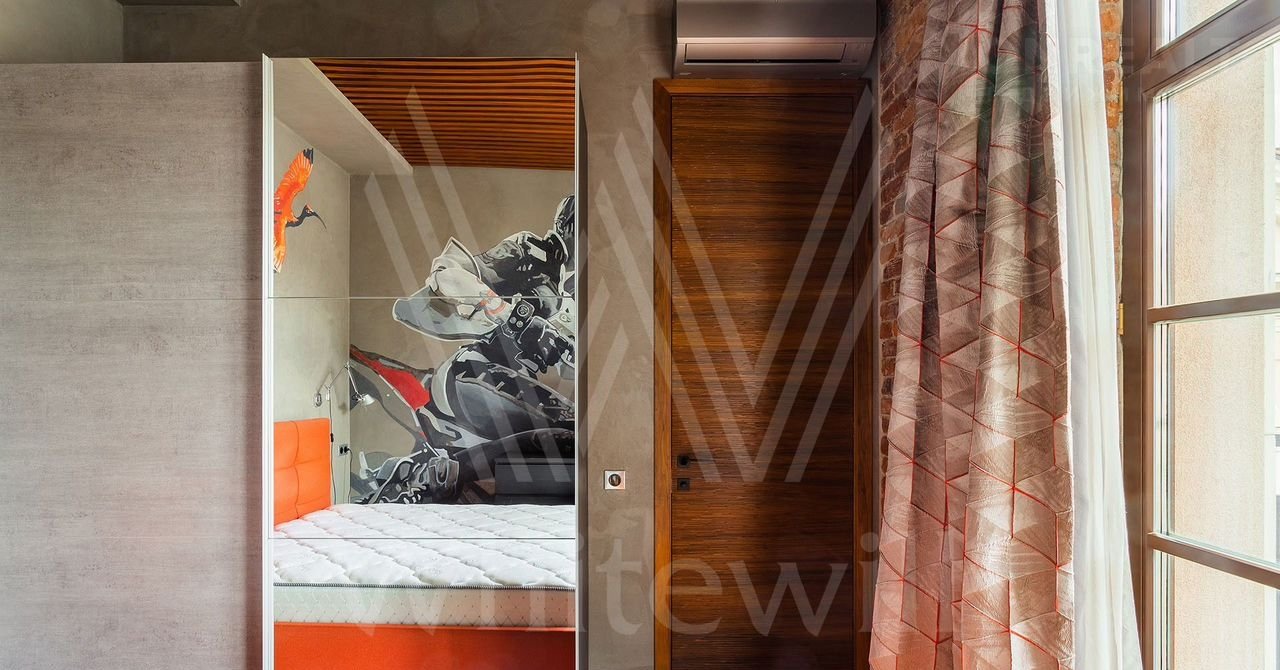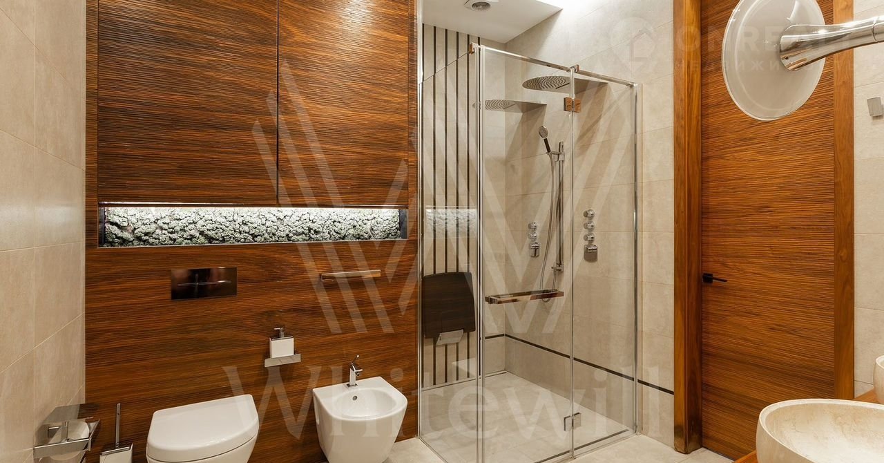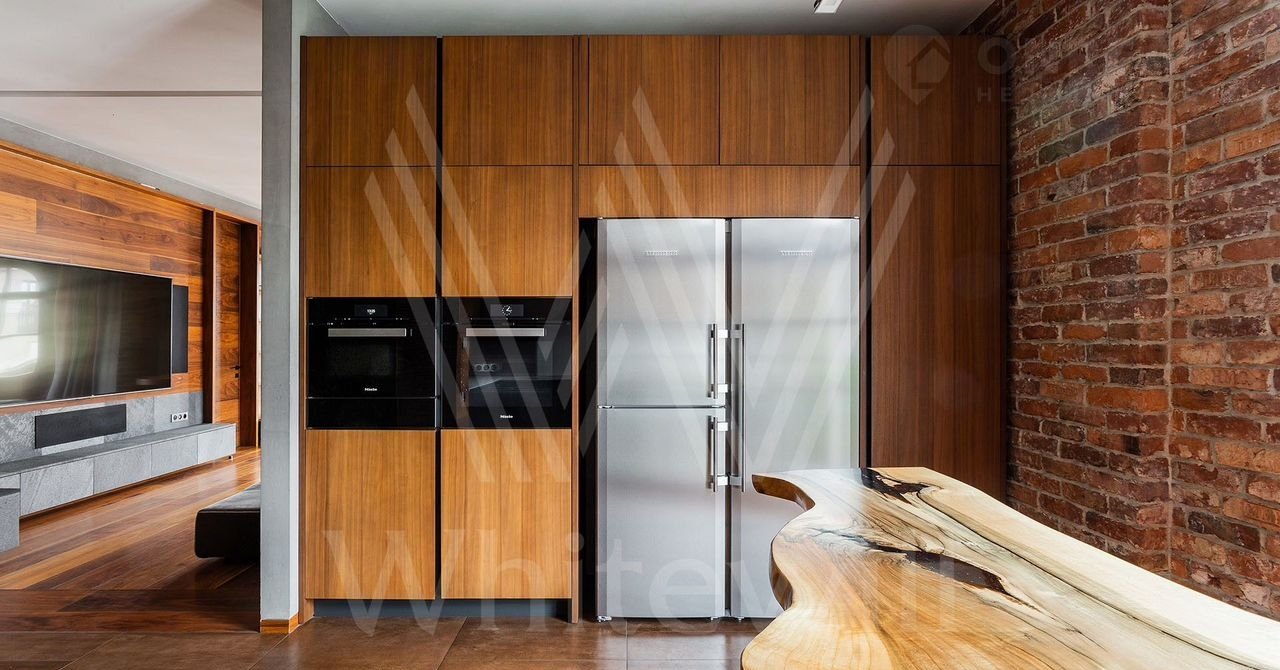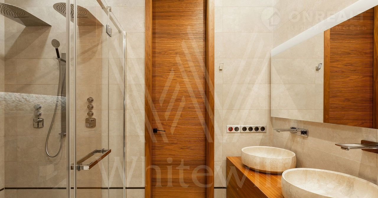 Выполнена авторская отделка с использованием натуральных материалов — американских орех, древний аммонит. На полу выложены плитка и паркетная доска. Произведены работы по комплексной шумоизоляции, установлены системы «умный дом» и индивидуального кондиционирования.