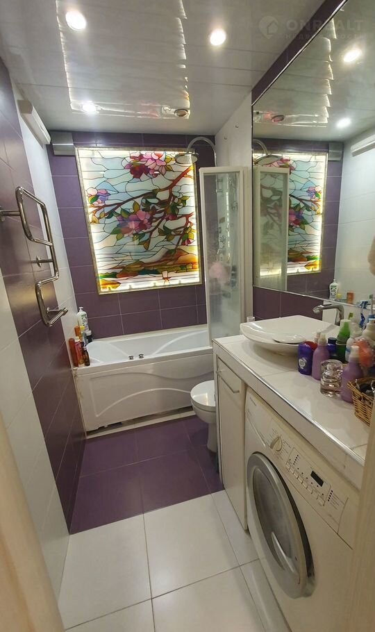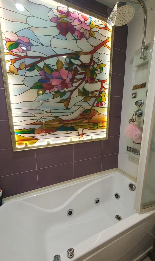 В ванной установлен витраж ручной работы с подсветкой, ванная с гидромассажем, гигиенический душ, стиральная машина Еlесtrоluх, теплые полы, принудительная вытяжка, а также эргономичная ротерная дверь.