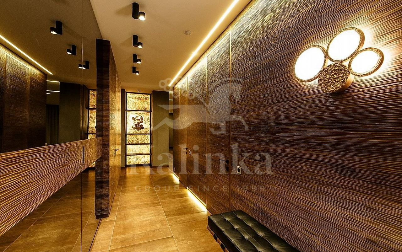 Сделана премиальная отделка Эко-френдли, настоящий древний аммонит, использование американского ореха, слэба, настоящего мха.