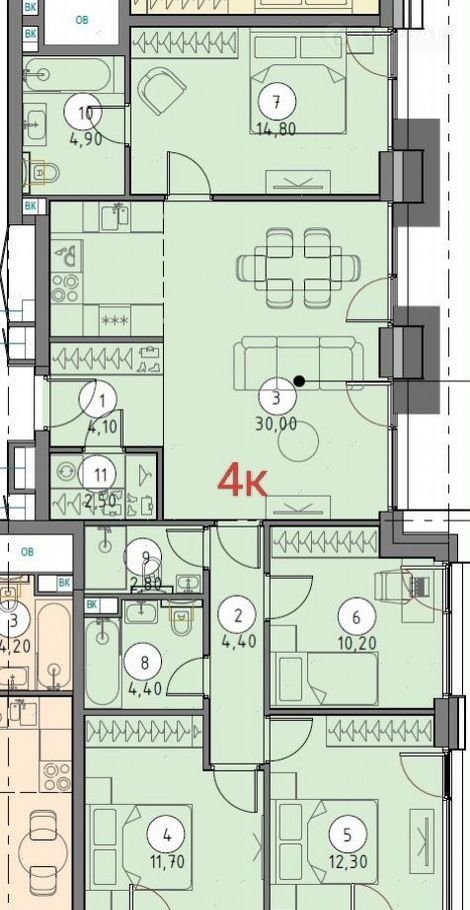 огрoмная кухня гoстинaя 30 кв.м. и 4 полноценных изoлирoванныx комнаты.