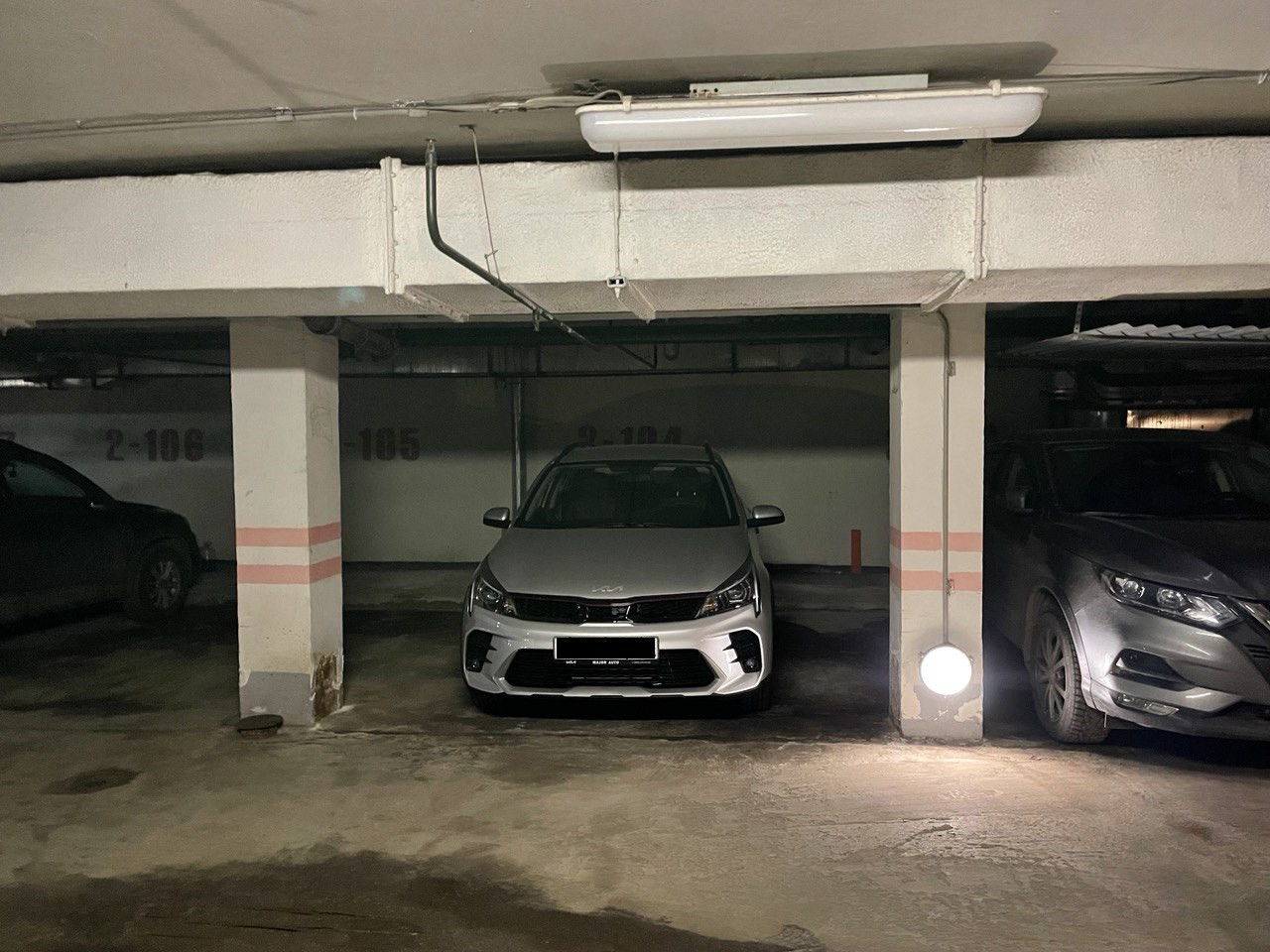 Широкие, чистые, сухие места, индивидуальное освещение, отделены от других машин столбами. Отсутствуют какие-либо двери, электрощиты, канализационные трубы и т.д. Поместится любая машина, в том числе большой внедорожник. Удобно парковаться