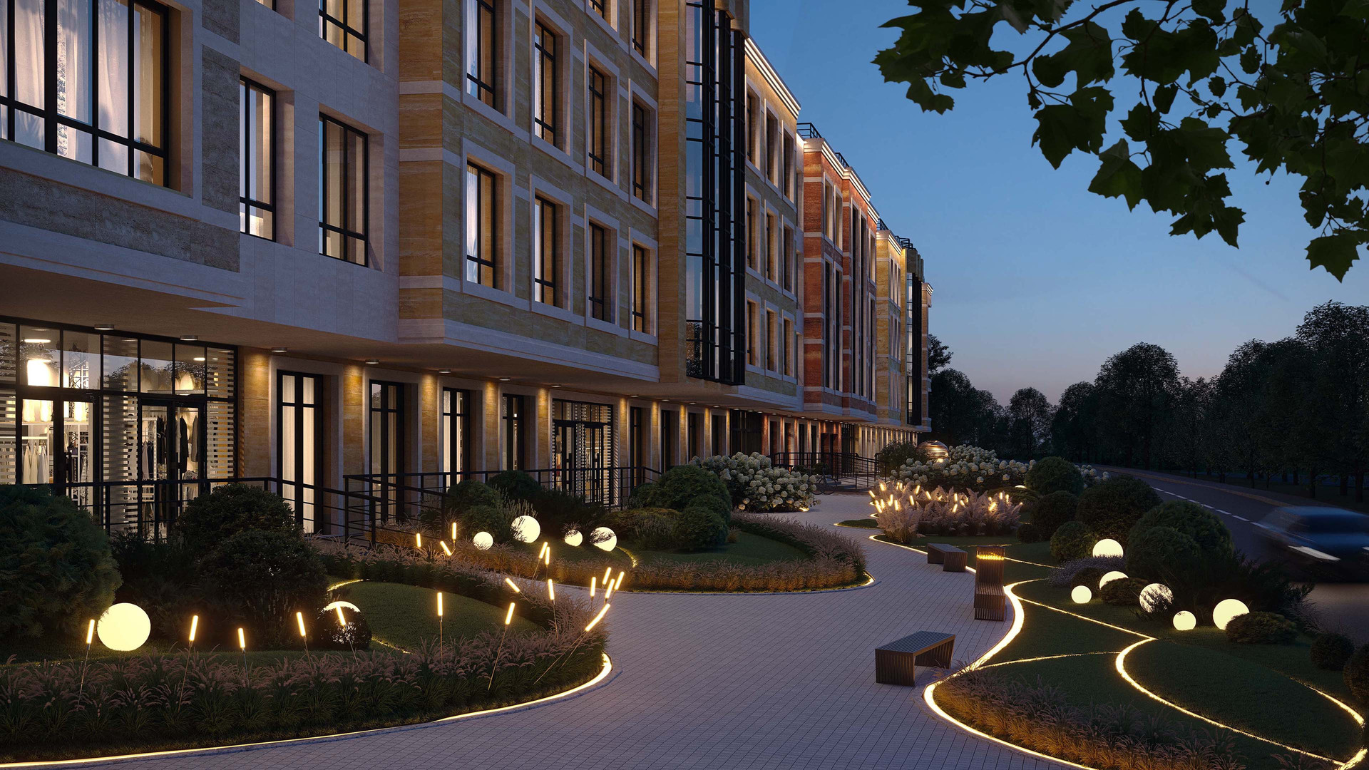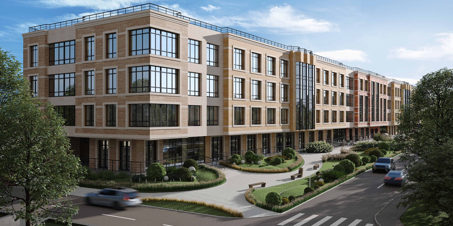 Фасад здания украшают оригинальные эркеры и панно из натурального камня, сочетающего в себе 5 оттенков травертина, символизирующих старинные испанские улицы.