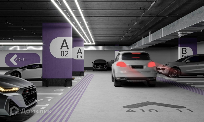 В доме двухуровневый подземный паркинг на 497 машиномест с возможностью установки зарядных устройств для электромобилей, автомойкой и кладовыми помещениями. Прямой лифт идет из паркинга на любой этаж.