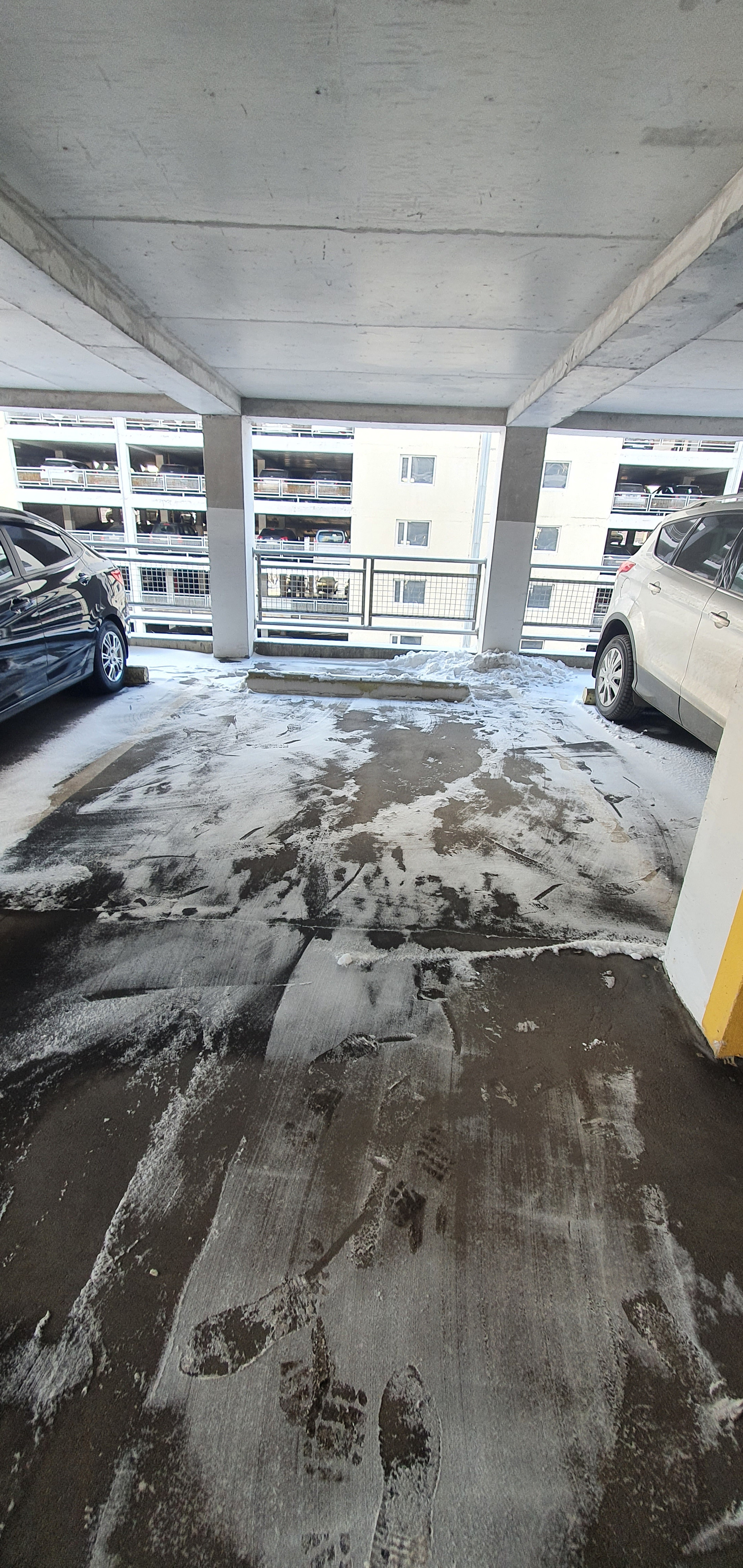 на 5 этаже, в отличном состоянии, потолок не течет, с 2 сторон столбы, что остерегает от случайного удара дверью рядом стоящей машины или аварии в случае парковки соседа. На многоуровневом паркинге.