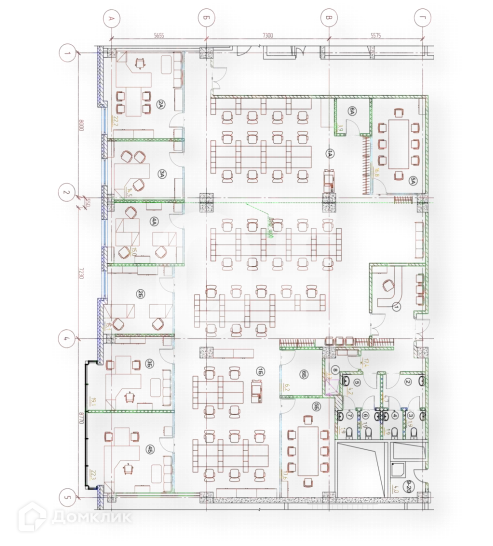 В офисе ресепшн, кухня, хоз.комната, 4 санузла, 2 переговорные, 6 кабинетов, большой опен-спейс, серверная.