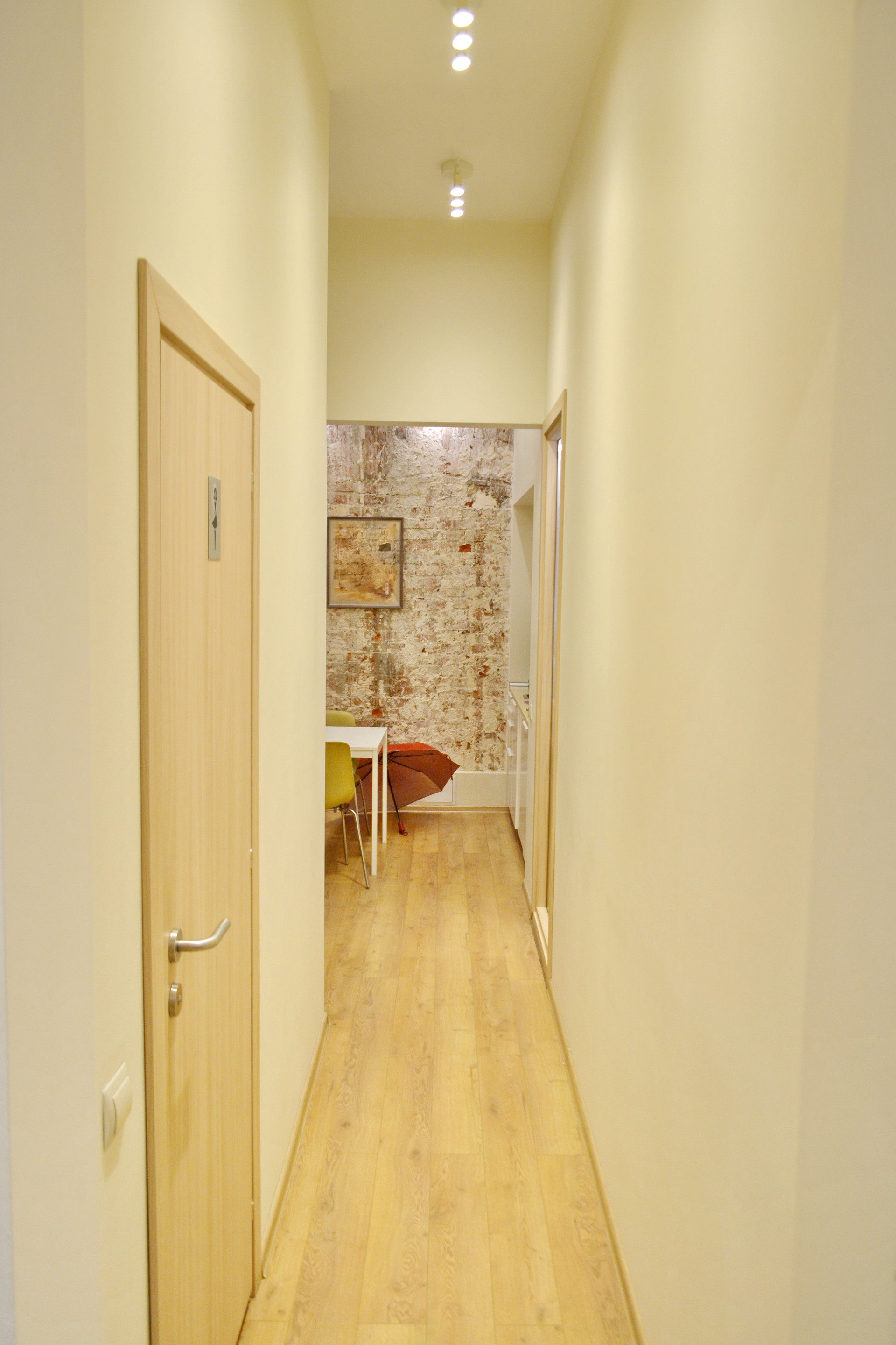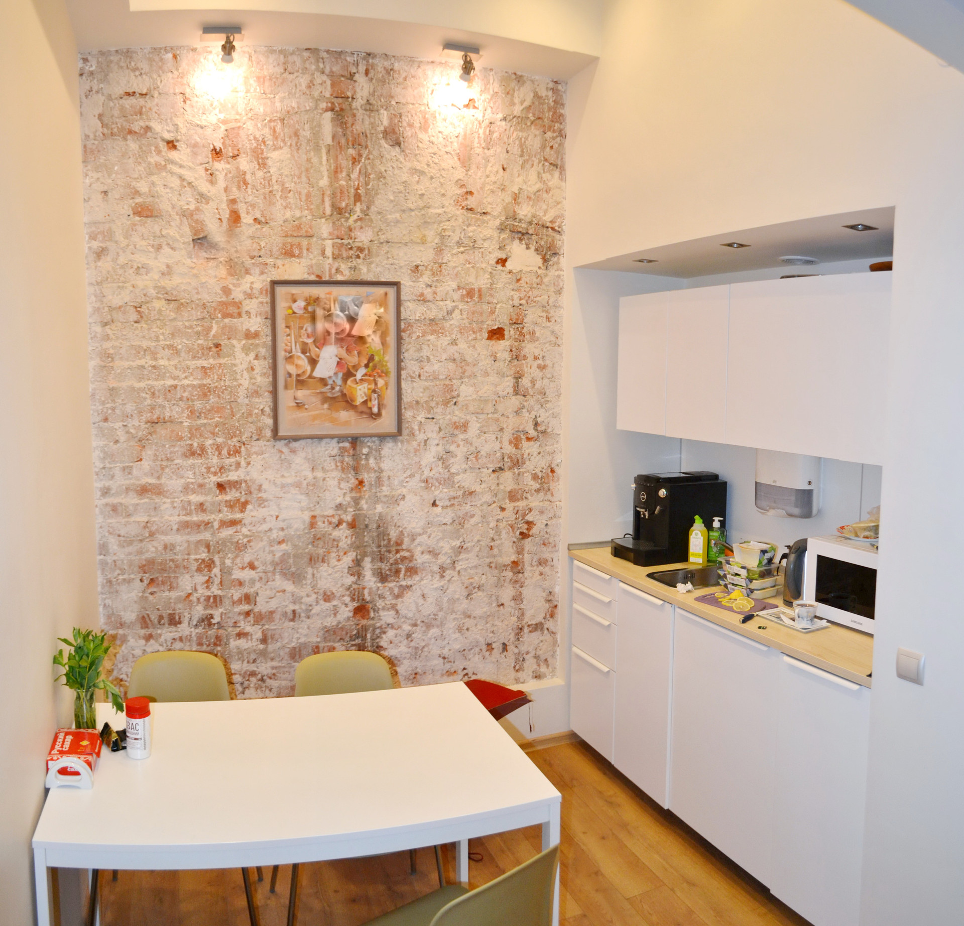 Помещение после дизайнерского - капитального ремонта. Полностью замены все коммуникаций внутри помещения. Раскрыта историческая кирпичная кладка.