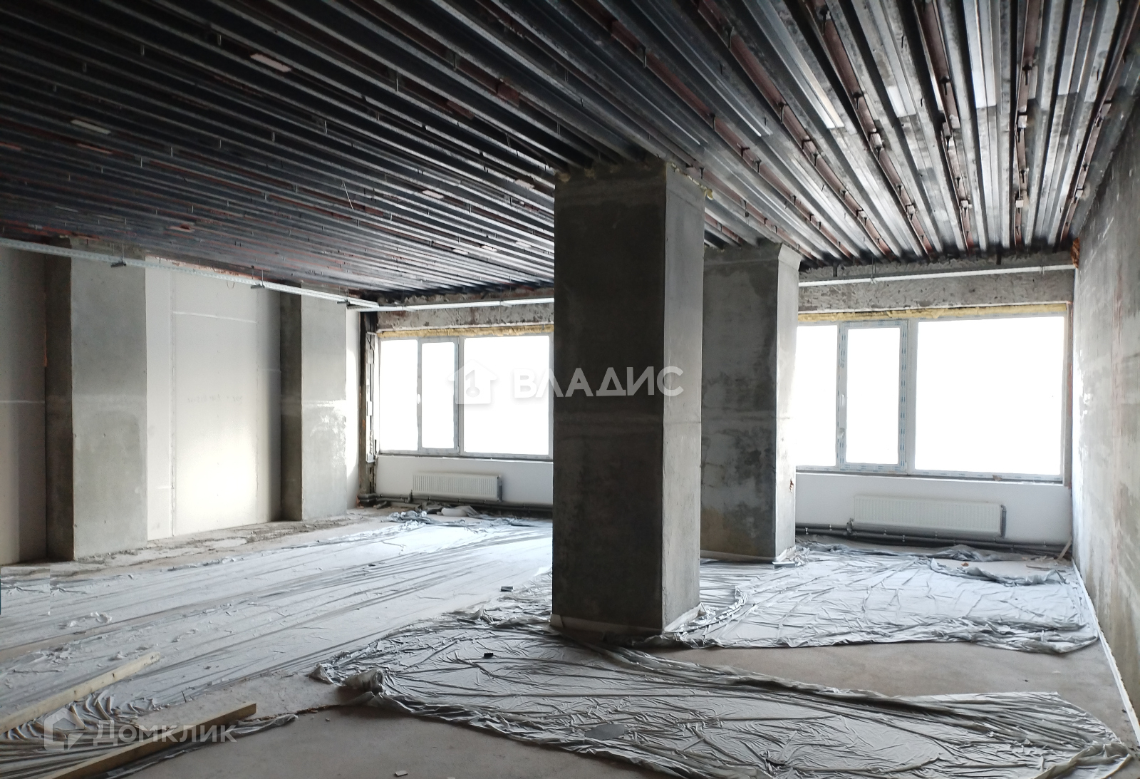 Помещение правильной прямоугольной формы, без отделки, панорамные окна на улицу во всю стену, обращены на юго-восток.