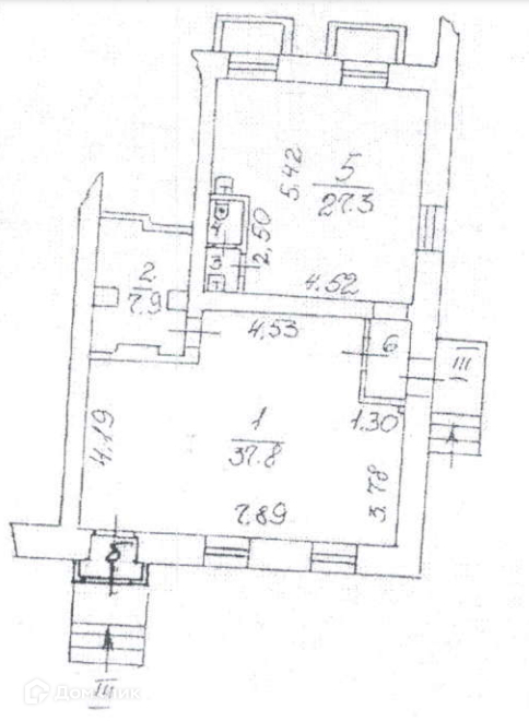 Помещение состоит из 2-х кабинетов (37,8 м2 и 27,3 м2), кухни - подсобки (7,9 м2) и туалета. Имеется 2 входа с улицы.