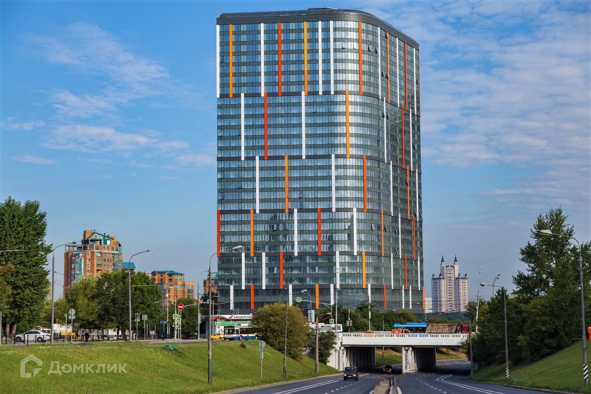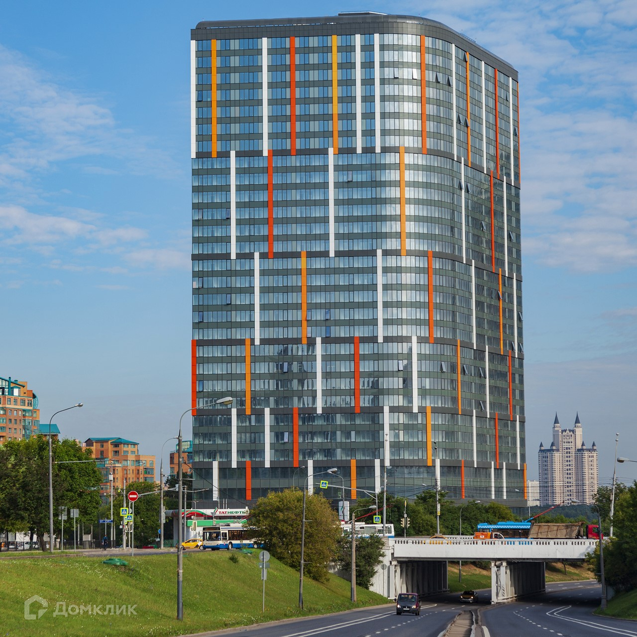 Многофункциональный комплекс на участке 47 соток представлен одним монолитно-кирпичным 29-этажным зданием в стиле хайтек с панорамным витражным остеклением фасадов и необычной формы с дугообразной центральной секцией в плане.  В здание подведены все необходимые системы жизнеобеспечения, включая электроснабжение, водоснабжение, систему канализации, отопления, вентиляции, дымоудаления и пожаротушения..