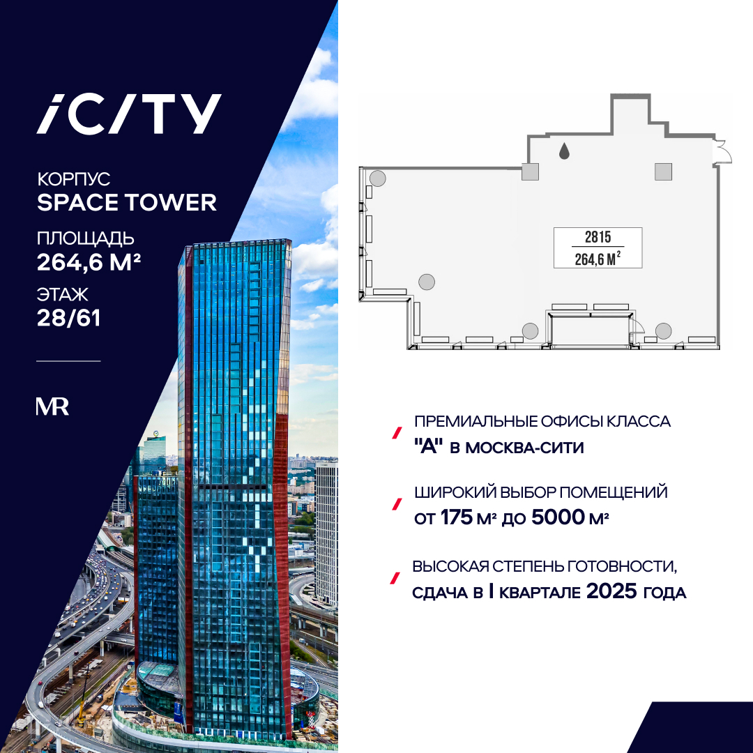 Предлагается офисное помещение, с рассрочкой 0%, площадью 264,6 м2 на 28 этаже в башне "Space Tower" деловых небоскребов класса "А" iCITY. Расположен в Москва-Сити. Проектом предусмотрена уникальная система проветривания помещений. Свободная планировка. Отделка Shell and Core. Высокие потолки 3,75 м и панорамное остекление обеспечивают отличную инсоляцию.