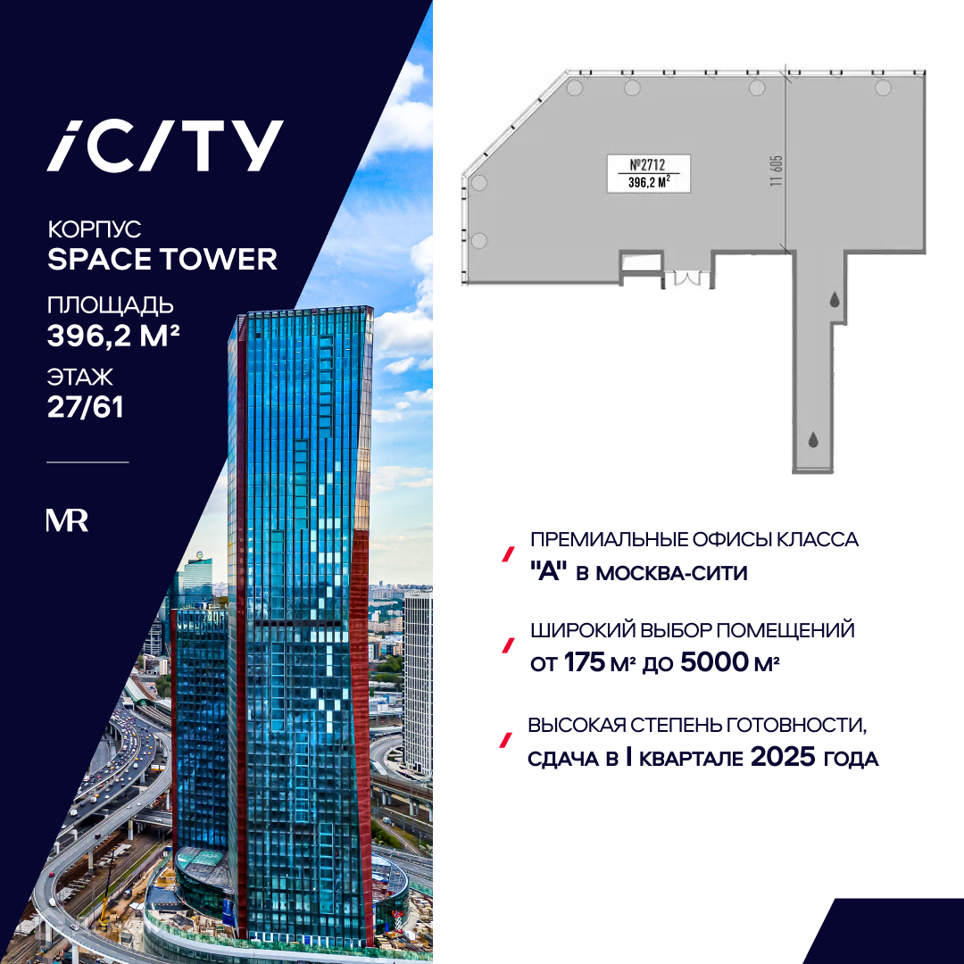 Предлагается офисное помещение, с рассрочкой 0%, площадью 396,2 м2 на 27 этаже в башне "Space Tower" деловых небоскребов класса "А" iCITY. Расположен в Москва-Сити. Проектом предусмотрена уникальная система проветривания помещений. Свободная планировка. Отделка Shell and Core. Высокие потолки 3,75 м и панорамное остекление обеспечивают отличную инсоляцию.