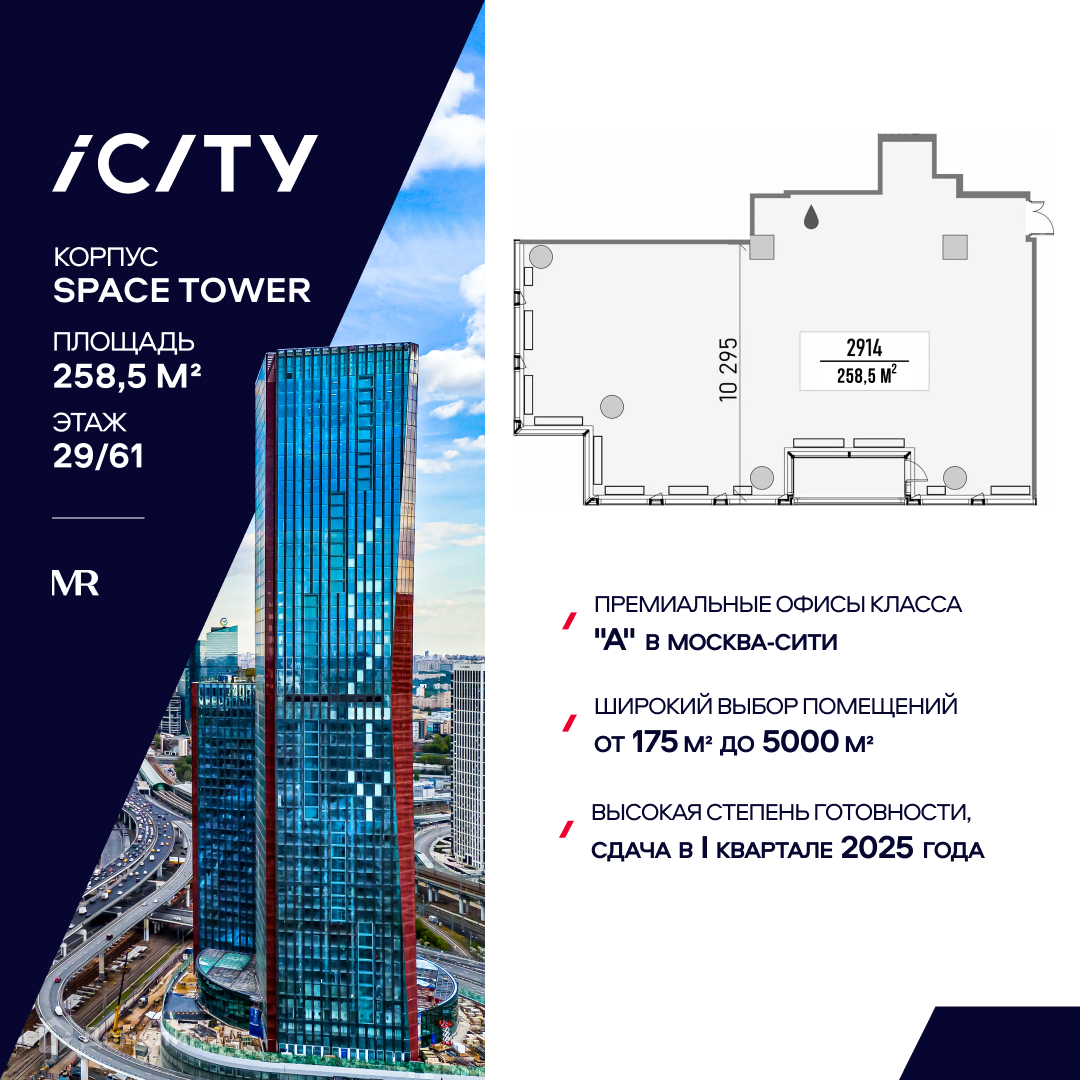 Предлагается офисное помещение, с рассрочкой 0%, площадью 258,5 м2 на 29 этаже в башне "Space Tower" деловых небоскребов класса "А" iCITY. Расположен в Москва-Сити. Проектом предусмотрена уникальная система проветривания помещений. Свободная планировка. Отделка Shell and Core. Высокие потолки 3,75 м и панорамное остекление обеспечивают отличную инсоляцию.