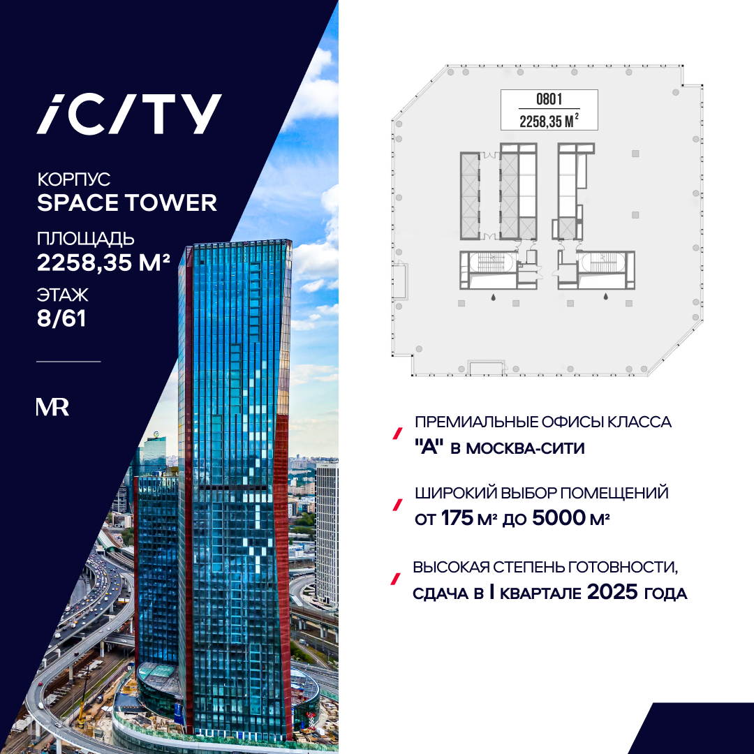 Предлагается офисное помещение, с рассрочкой 0%, площадью 2258,35 м2 на 8 этаже в башне "Space Tower" деловых небоскребов класса "А" iCITY. Расположен в Москва-Сити. Проектом предусмотрена уникальная система проветривания помещений. Свободная планировка. Отделка Shell and Core. Высокие потолки 3,75 м и панорамное остекление обеспечивают отличную инсоляцию.