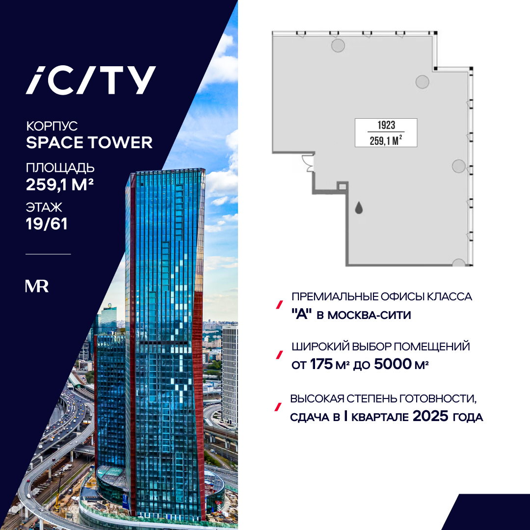 Предлагается офисное помещение, с рассрочкой 0%, площадью 259,1 м2 на 19 этаже в башне "Space Tower" деловых небоскребов класса "А" iCITY. Расположен в Москва-Сити. Проектом предусмотрена уникальная система проветривания помещений. Свободная планировка. Отделка Shell and Core. Высокие потолки 3,75 м и панорамное остекление обеспечивают отличную инсоляцию.