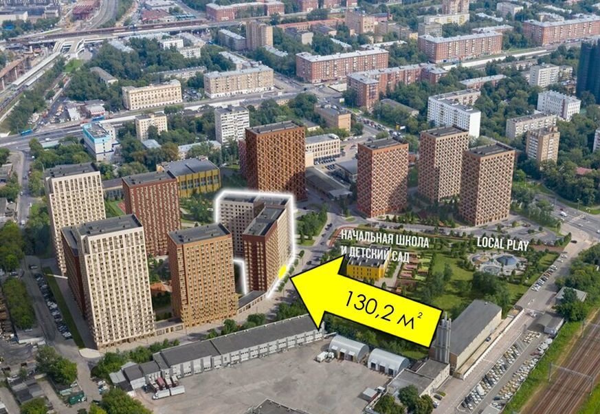 Помещение находится в корпусе 3.2 и выходит на центральный внутриквартальный проезд и пешеходную зону. Рядом будет расположен детский сад и школа, а также большой парк и прогулочная зона.