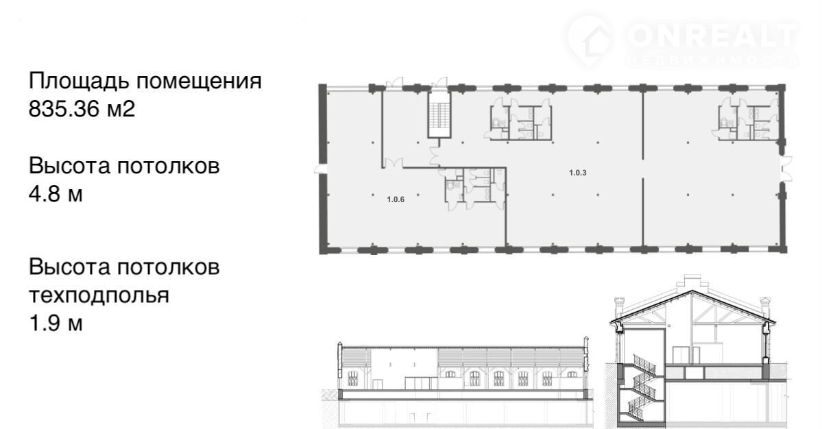 • Высота потолков: 1 этаж - 4,8 м, тех. подполье - 1,9 м