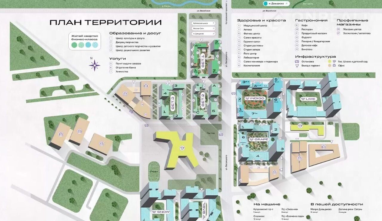 Комплекс расположен в Можайском районе, на Верейской улице, между природной зоной долины реки Сетунь, Кутузовским и Мичуринским проспектами. Рядом находится Школа управления «Сколково», Мещерский парк, экотропа «Сетунь». В 20 минутах ходьбы расположено метро «Давыдково», а природный парк «Долина реки Сетунь» находится всего в 3 минутах.