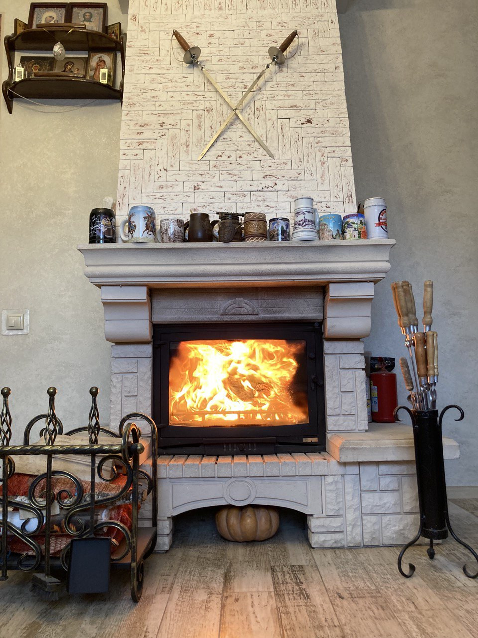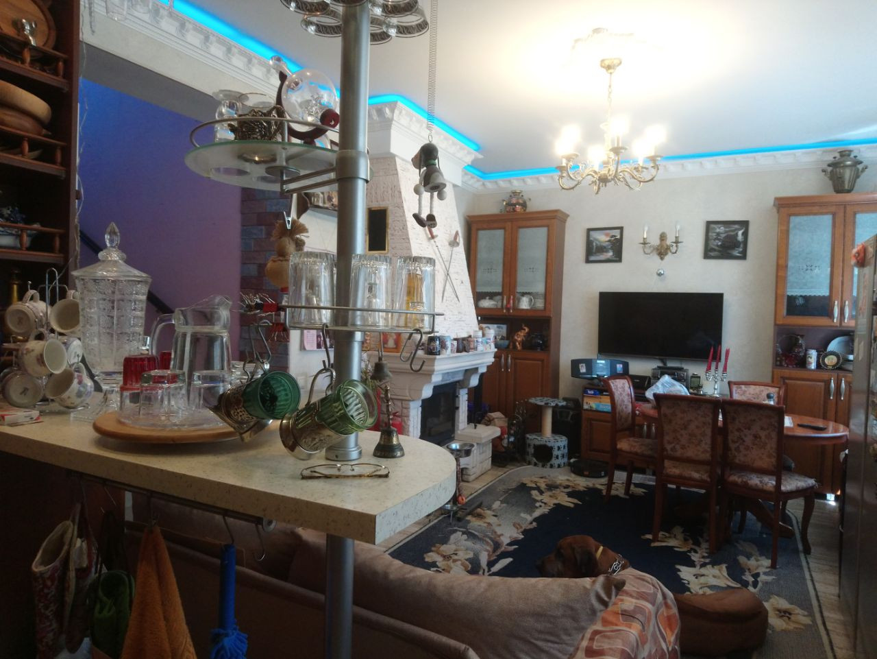1 этаж: коридор, кухня-столовая 28 кв.м. с барной стойкой и дровяным камином, спальня .