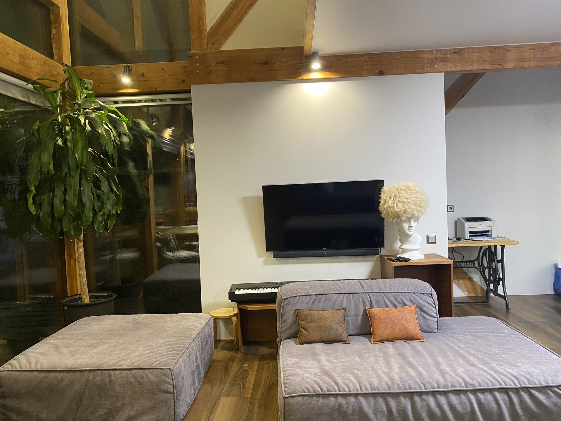 На первом этаже воздушная гостиная со вторым светом и выделенной кухонной зоной; кабинет, санузел с ванной и душевой.