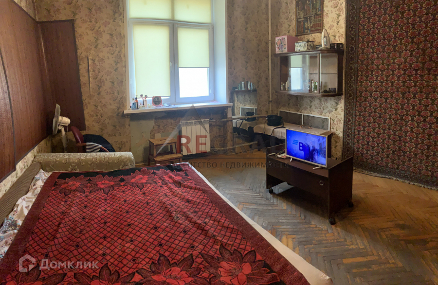 Комната 18м, в ней двуспальный диван, 2 шкафа, комод, телевизор.