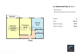 Сдам двухкомнатную квартиру, 54 м2, улица Марьинский Парк, 3к1