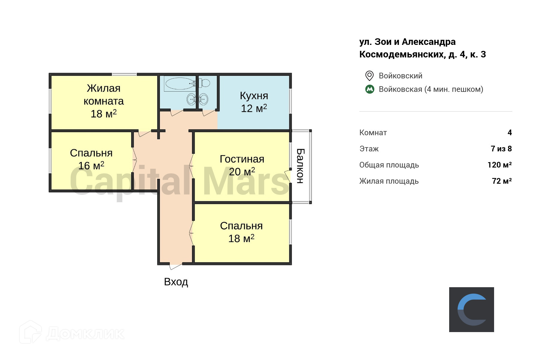 Жилая площадь 72 м2
