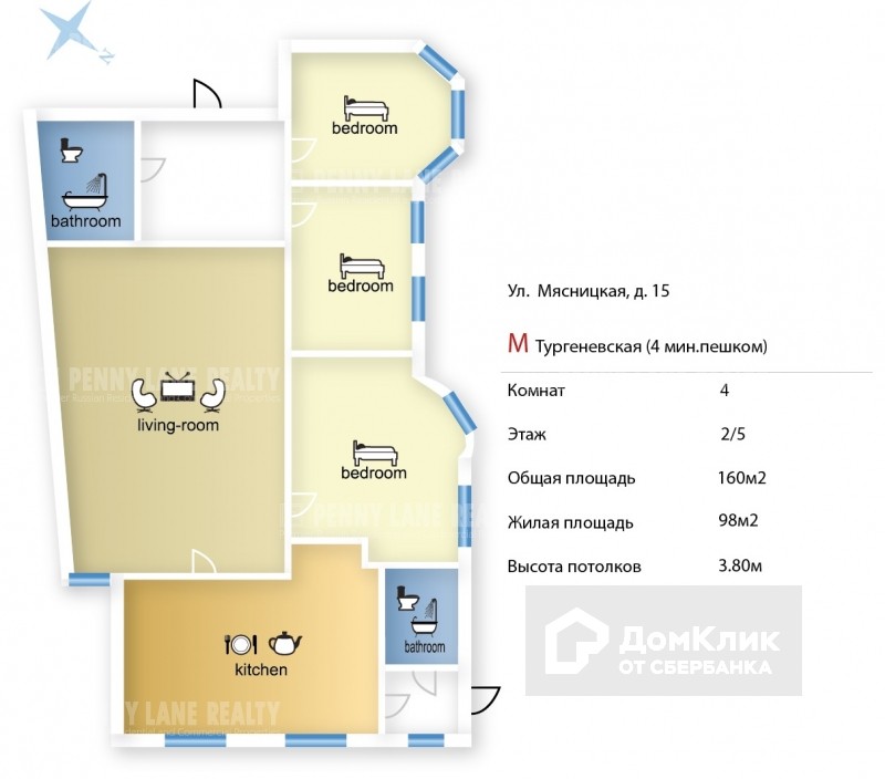 4-комнатная квартира, 160 м2, в аренду на длительный срок в Москве, Мясницкая улица, 15
