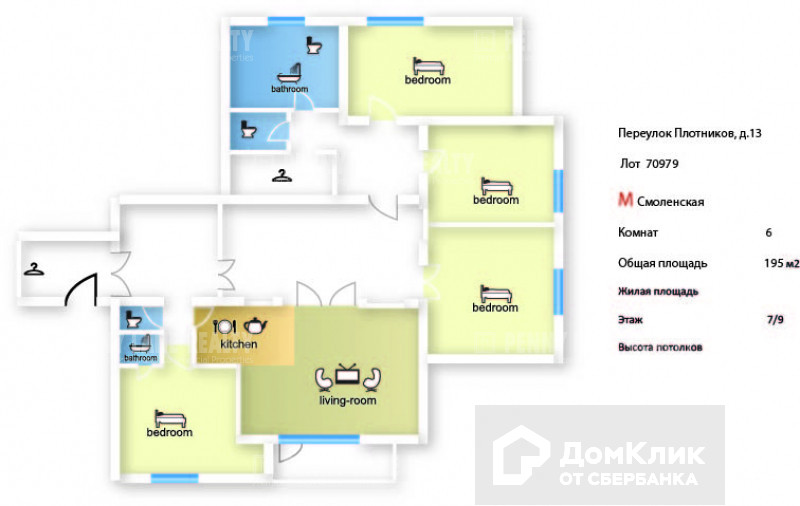 5-комнатная квартира, 195 м2, в аренду на длительный срок в Москве, Плотников переулок, 13
