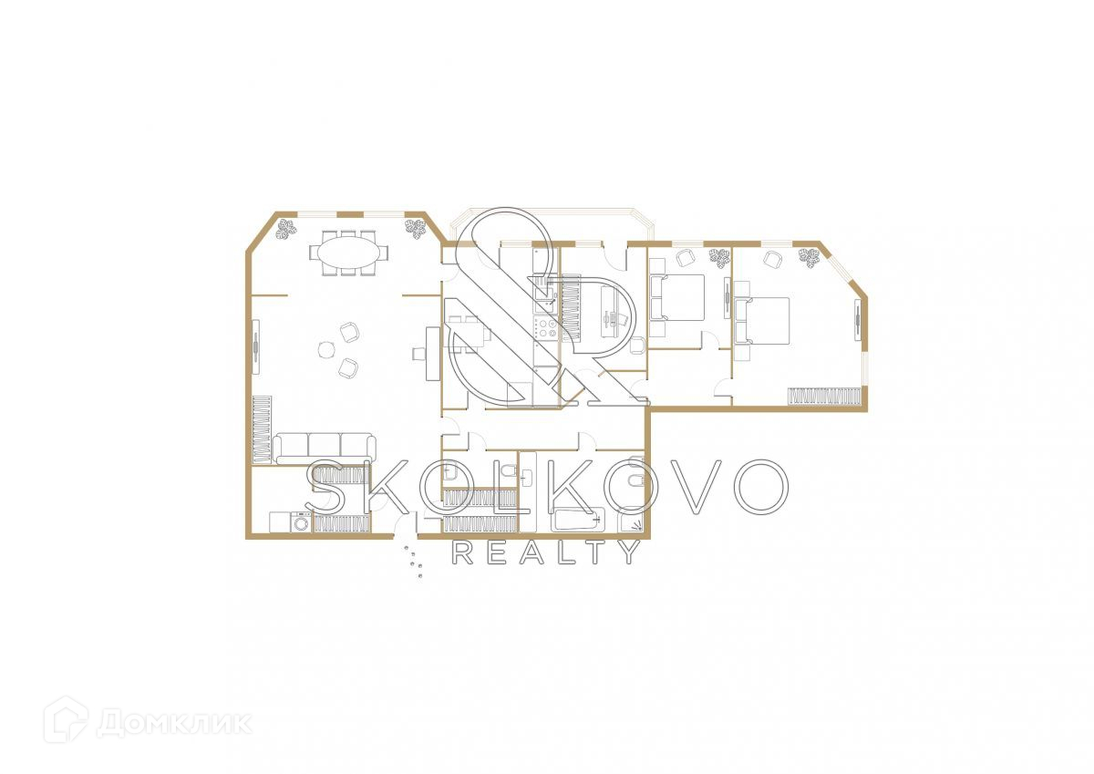 Планировочное решение: гостиная, объединенная с кухней, 2 спальни, кабинет, санузел, гостевой санузел, гардеробная комната. Квартира полностью меблирована и оснащена бытовой техникой от ведущих производителей. Установлены люстры от фирмы Baccarat.