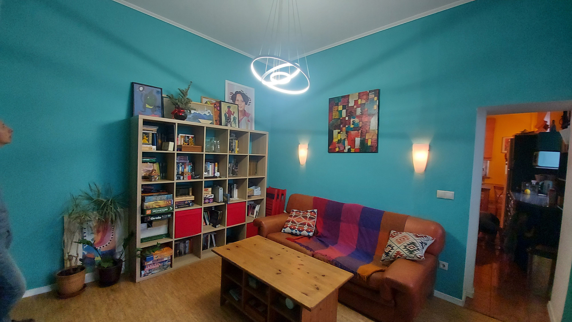 стеллажи, обеденная зона с авторским дизайном. Полы  паркетные и пробковые, в санузлах и