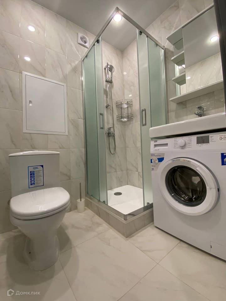 Ванная комната: компактная ванная комната с душевой кабиной, мраморный поддон с антискользящим покрытием.  Стиральная машинка - новая.