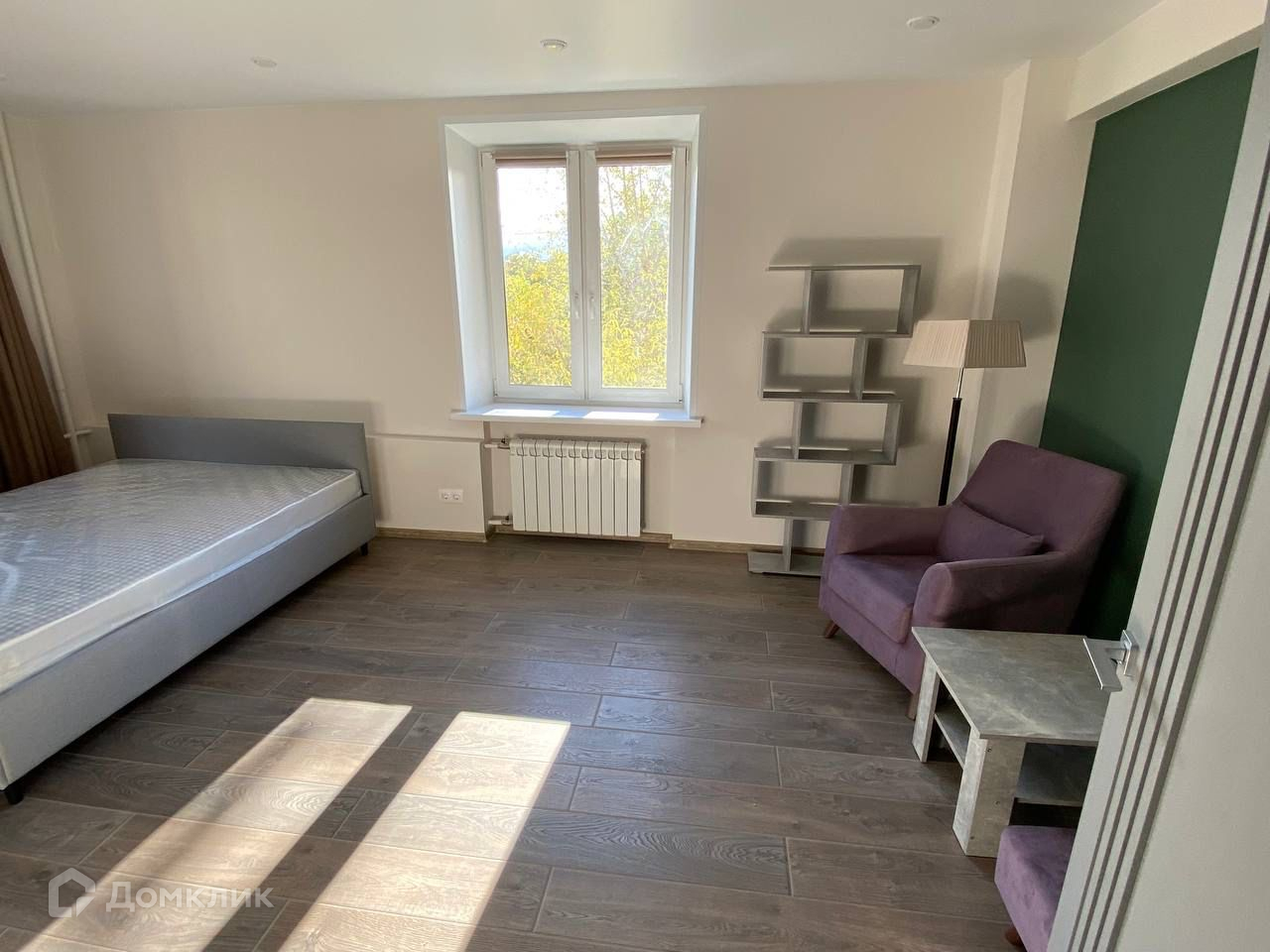 В спальне новая двуспальная кровать и матрас Moon. Сделана уютная зона для отдыха и чтения: кресло, стеллаж и итальянский торшер. Подключено антенное ТВ. Есть возможность подключения Интернета.