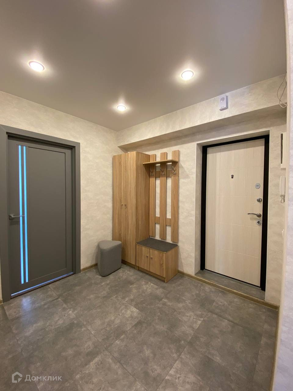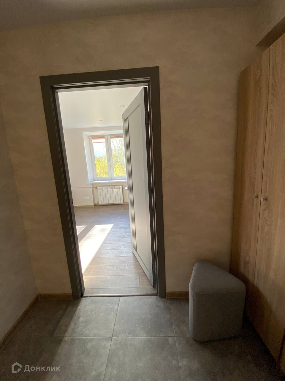 Просторная прихожая с небольшим шкафом и пуфом.