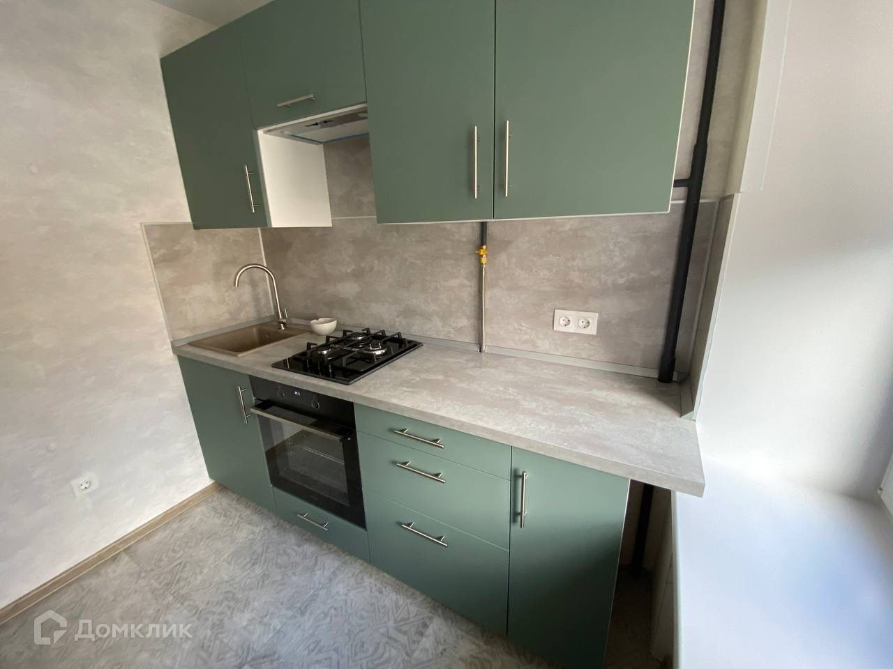 Кухня: новая газовая варочная панель и встроенный духовой шкаф Gorenje, есть чайник, телевизор, холодильник, обеденный стол табуретки, посуда… в общем, всё необходимое.