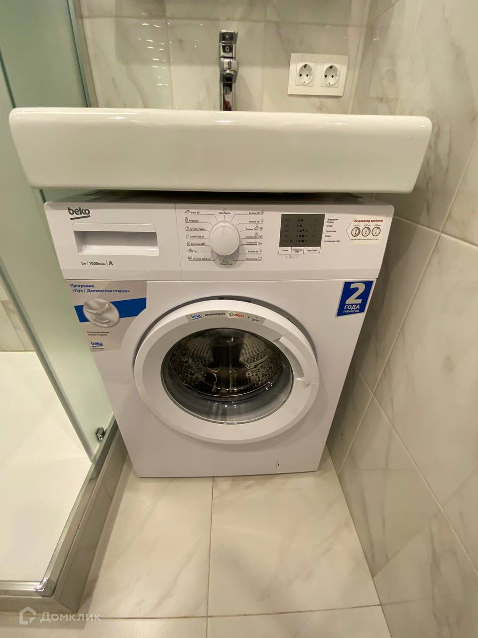 Ванная комната: душевая кабина, мраморный поддон с антискользящим покрытием.  Стиральная машинка - новая.